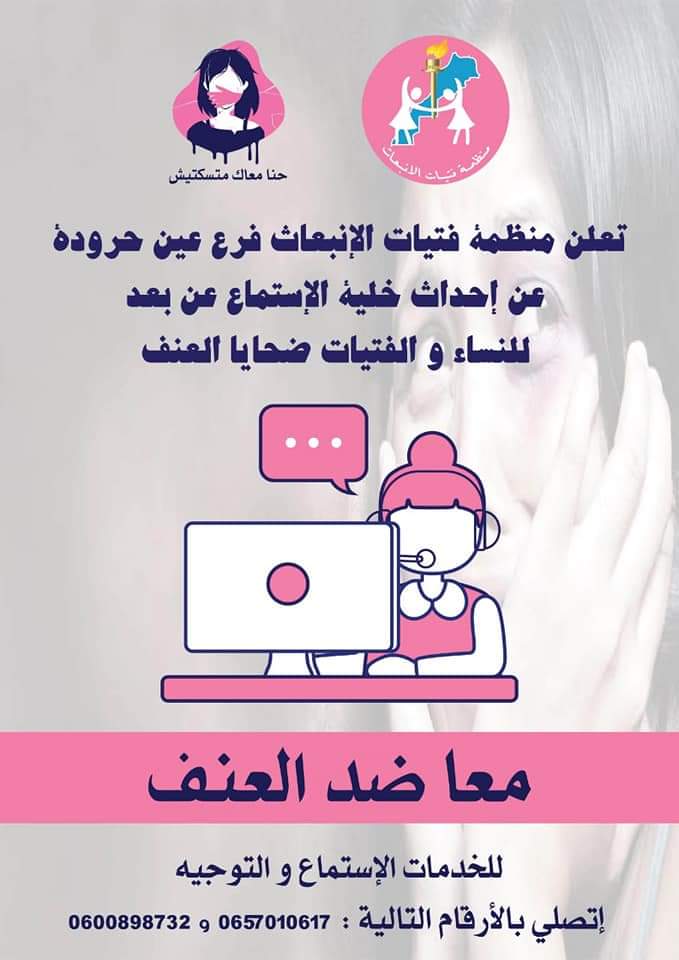 أحدثت منظمة فتيات الإنبعاث فرع عين حرودة (المحمدية)، خلية الإستماع عن بعد للنساء والفتيات ضحايا العنف، تضم هذه الخلية مجموعة من المستمعات والمحاميات و الأخصائيين، سيسهرون على توفير خدمات الإستماع و التوجيه و المرافقة والدعم النفسي عن بعد.