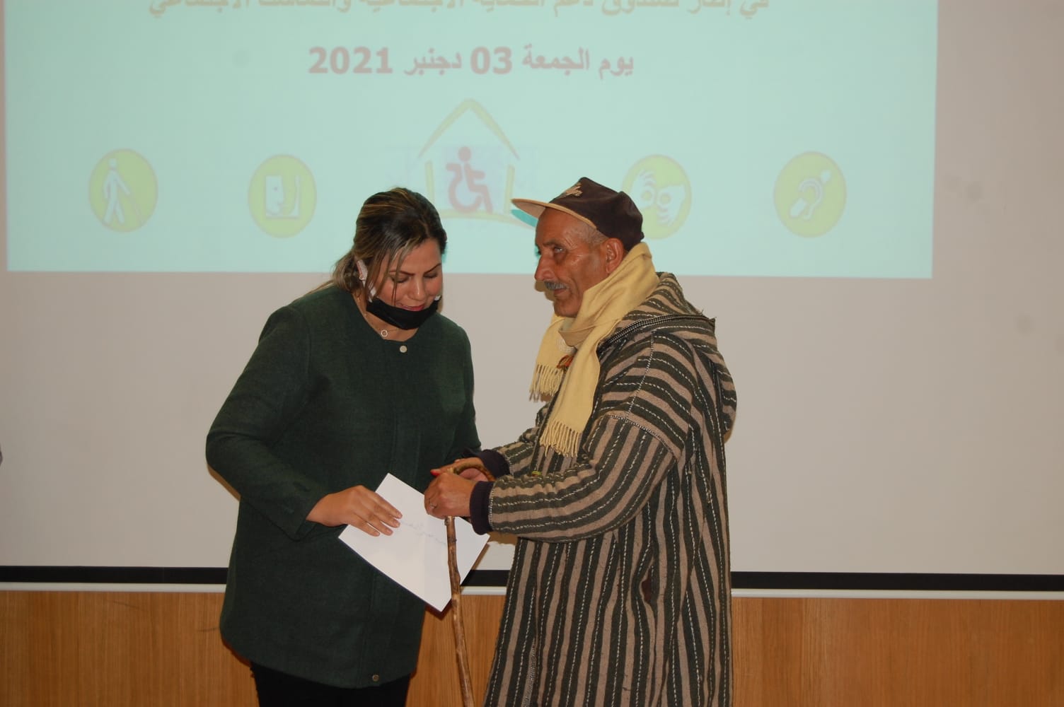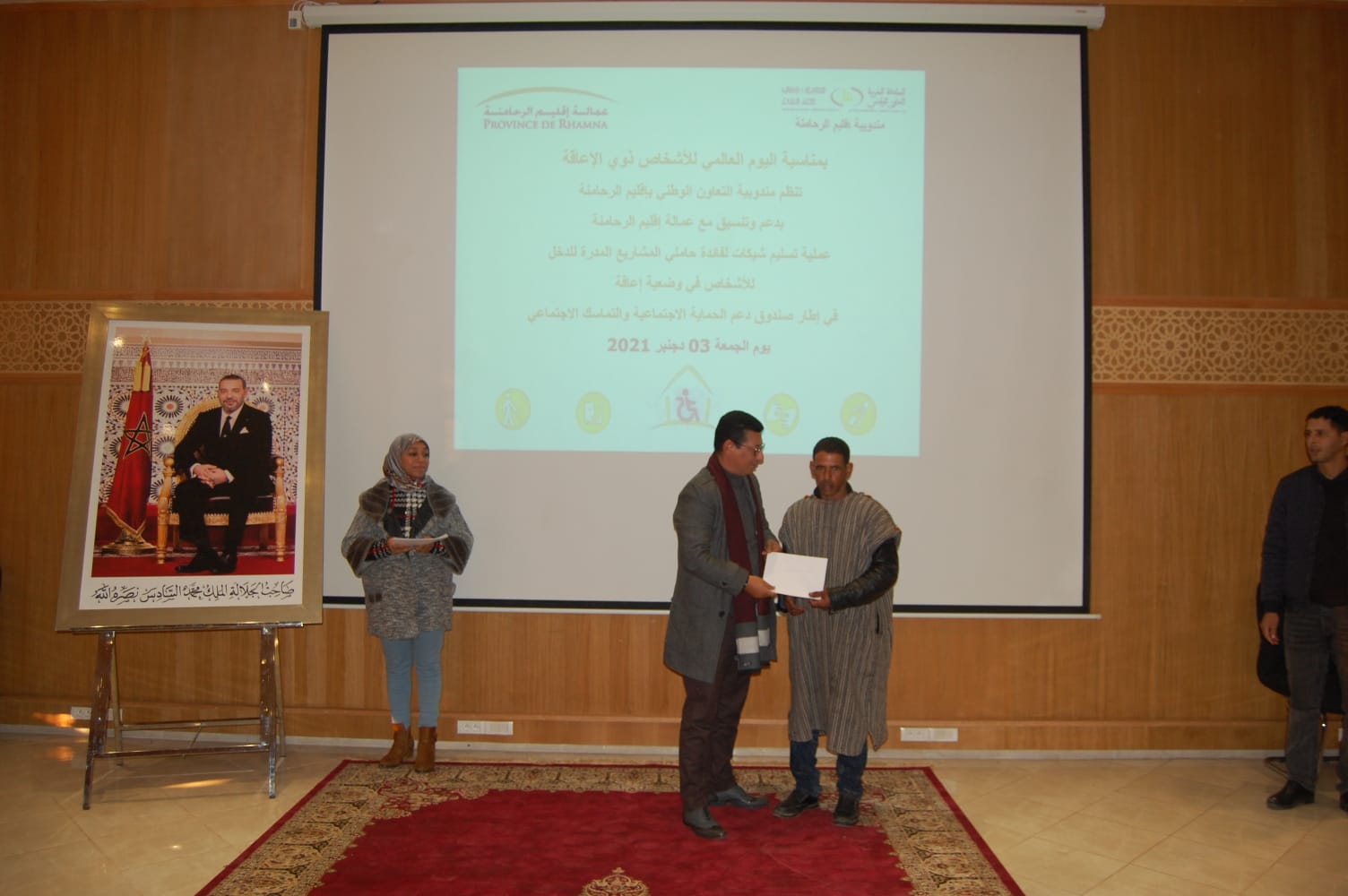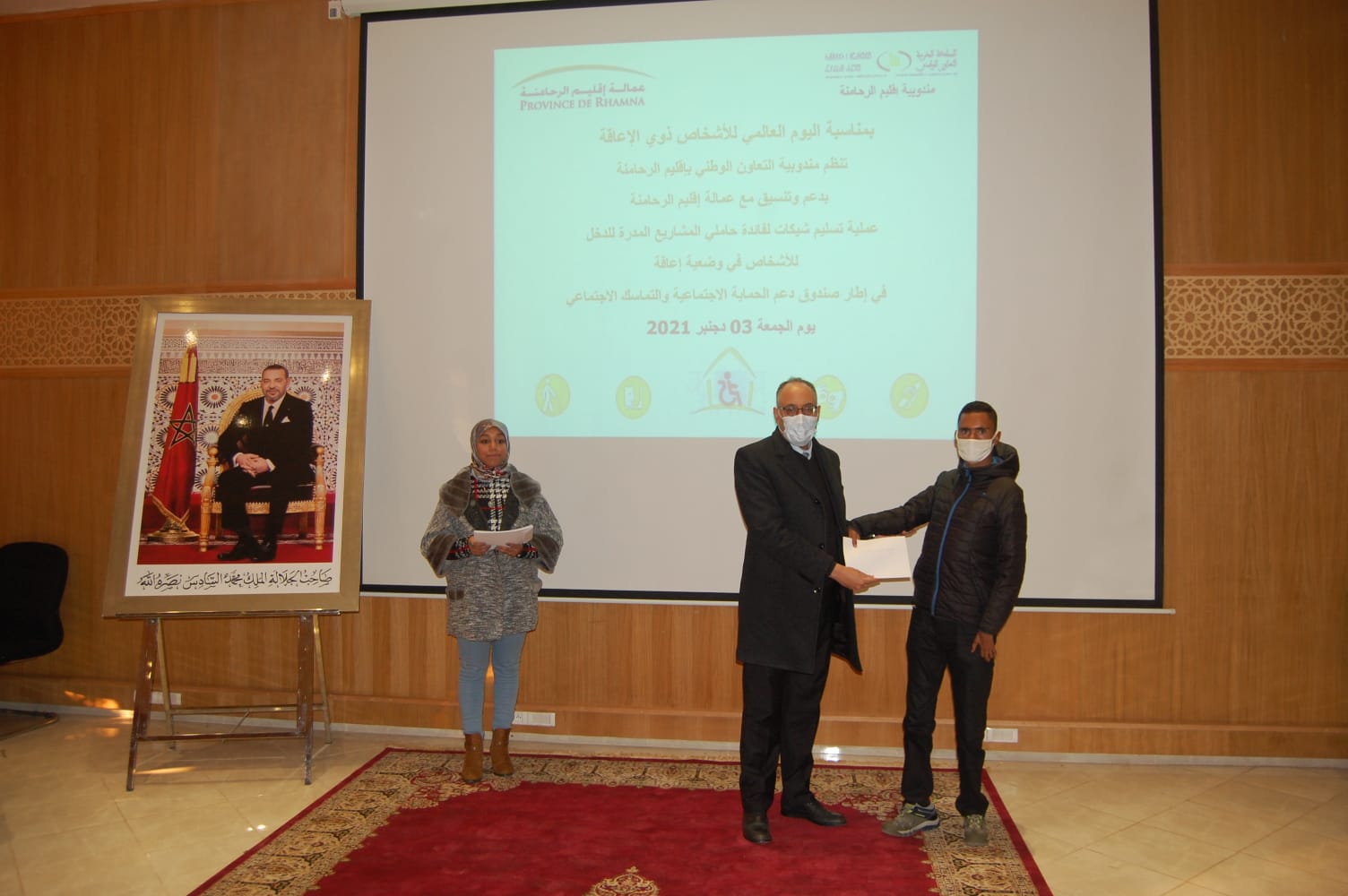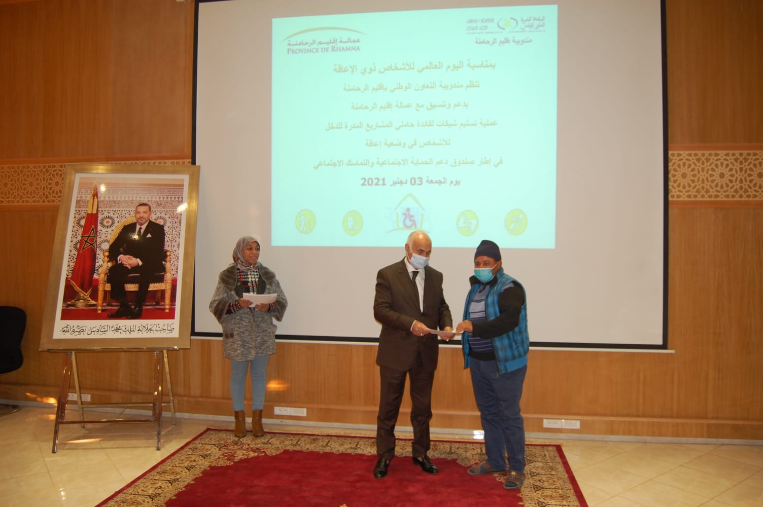 بمناسبة الاحتفال باليوم العالمي للأشخاص ذوي الإعاقة، أشرفت السلطة الإقليمية بالرحامنة بشراكة مع مندوبية التعاون الوطني بإقليم الرحامنة، يومه الجمعة 03 دجنبر 2021، بمقر عمالة الإقليم ،على حفل تسليم شيكات لفائدة حاملي المشاريع من الأشخاص في وضعية ٳعاقة والممولة في ٳطار برنامج تشجيع الاندماج المهني والأنشطة المدرة للدخل لقطاع التعاون الوطني، والبالغ عددهم 16 مستفيد(ة) بتكلفة ٳجمالية بلغت 864.000,00 درهم.