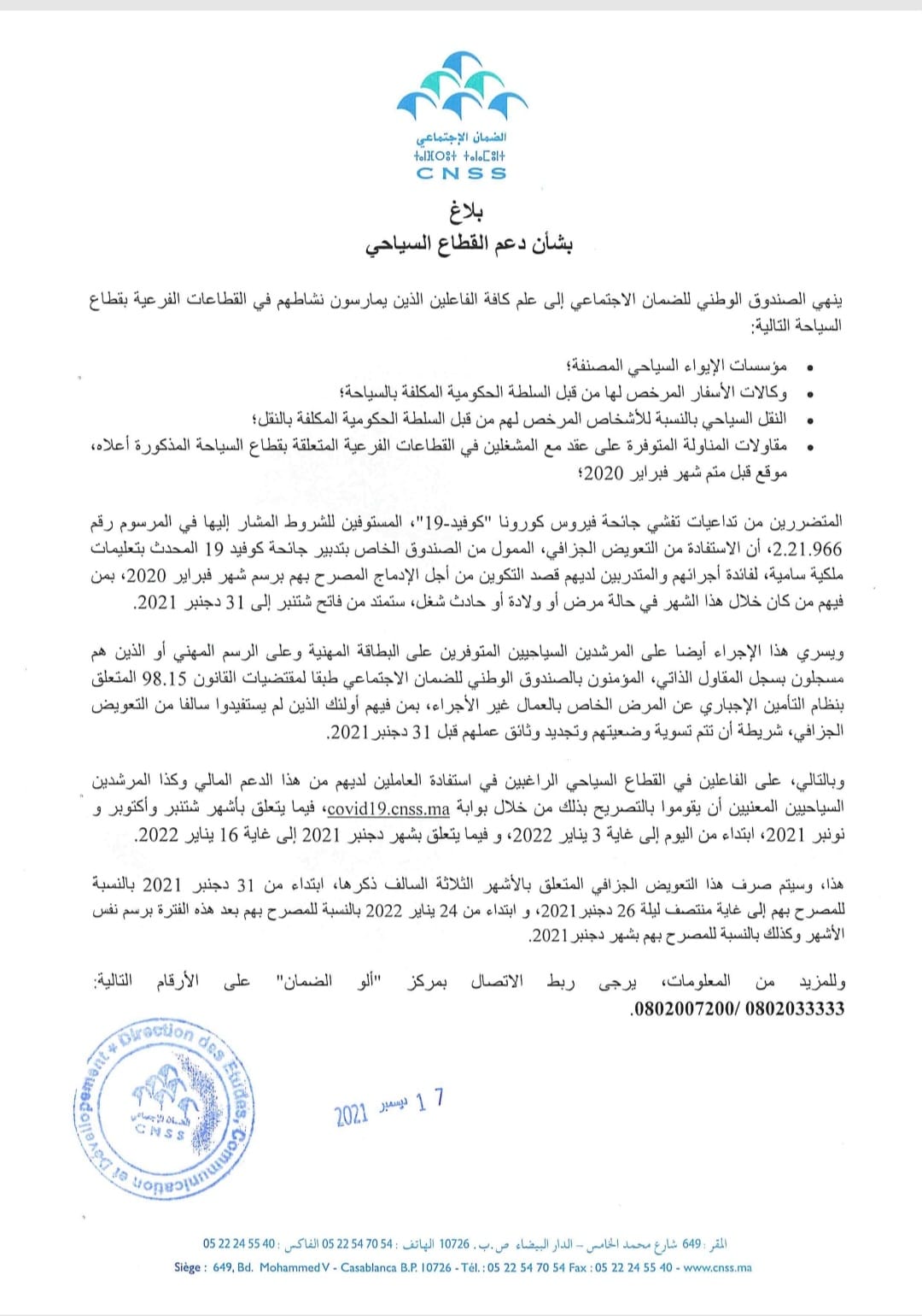 بلاغ من الصندوق الوطني للضمان الاجتماعي بشأن دعم القطاع السياحي