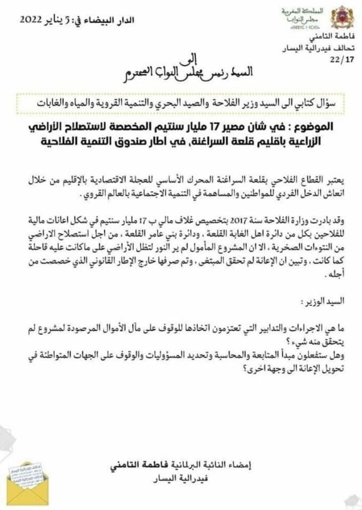النائبة البرلمانية عن فدرالية اليسار فاطمة التامني، تطرح سؤالاً كتابياً لوزير الفلاحة السيد محمد صدقي حول مصير 17 مليار خصصتها وزارة الفلاحة كاعانات للفلاحين في عهد اخنوش سنة 2017 ببعض الدوائر بقلعة السراغنة بهدف استصلاح الأراضي الفلاحية، إلا أن المشروع لم ير النور و ظلت الأراضي على ما كانت عليه، و تم تحويل الأموال إلى وجهات أخرى ، فماهي قصة 17 مليار أخرى ودائماً المستفيد من وزارة الفلاحة ،من يحاسب من في هذه الملايير التي تصرف في غير محلها ،اسئلة تنتظر جواب وزير الفلاحة .
