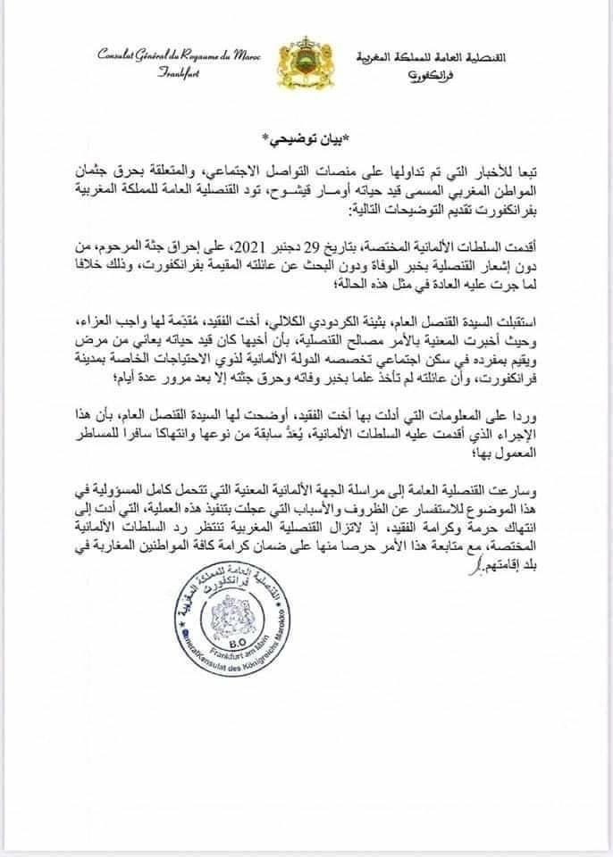 أثار إقدام السلطات الألمانية على إحراق جثة مواطن مغربي، توفي في فرانكفورت، غضبا في صفوف الجالية المغربية في ألمانيا، التي ناشدت، في نداء، الملك محمد السادس التدخل، متهمة في الوقت ذاته قنصلة المغرب في فرانكفورت بالتنصل من مهامها، وعدم التدخل لمساعدة أسرة المتوفى. وسجل النداء، الذي تم تداوله على مجموعات الجالية المغربية في ألمانيا، أن المغربي المدعو قيد حياته عمر قيشوح، توفي يوم 21 وانتقد المغرب بشدة حرق السلطات الألمانية جثمان مواطن مغربي بعد وفاته، دون إخبار المصالح القنصلية المغربية، أو البحث عن عائلته. وشددت وزارة الخارجية في بلاغ للقنصلية العامة للمغرب بمدينة فرانكفورت أن هذا الإجراء الذي أقدمت عليه السلطات الألمانية، يُعَدُّ سابقة من نوعها وانتهاكا سافرا للمساطر المعمول بها. هذا، وسارعت القنصلية العامة للمغرب بمدينة فرانكفورت إلى مراسلة الجهة الألمانية المعنية التي تتحمل كامل المسؤولية في هذا الموضوع للاستفسار عن الظروف والأسباب التي عجلت بتنفيذ هذه العملية، التي أدت إلى انتهاك حرمة وكرامة الفقيد، إذ لاتزال القنصلية المغربية تنتظر رد السلطات الألمانية المختصة، مع متابعة هذا الأمر حرصا منها على ضمان كرامة كافة المواطنين المغاربة في بلد إقامتهم. حسب بلاغ القنصلية. واستقبلت القنصل العام للمغرب بفرانكفورت، بثينة الكردودي الكلالي، أخت الفقيد، مُقدِّمة لها واجب العزاء، حيث أخبرت المعنية بالأمر مصالح القنصلية، بأن أخيها كان قيد حياته يعاني من مرض ويقيم بمفرده في سكن اجتماعي تخصصه الدولة الألمانية لذوي الاحتياجات الخاصة بمدينة فرانكفورت، وأن عائلته لم تأخذ علما بخبر وفاته وحرق جثته إلا بعد مرور عدة أيام. وكانت السلطات الألمانية المختصة، قد أقدمت بتاريخ 29 دجنبر 2021، على إحراق جثة المهاجرالمغربي ، من دون إشعار القنصلية بخبر الوفاة ودون البحث عن عائلته المقيمة بفرانكفورت، وذلك خلافا لما جرت عليه العادة في مثل هذه الحالة. واعتبرت وزارة الخارجية المغربية عبر القتصل العام للمملكة بفرانكفورت، بأن هذا الإجراء الذي أقدمت عليه السلطات الألمانية، يُعَدُّ سابقة من نوعها وانتهاكا سافرا للمساطر المعمول بها، حيث طالبت السلطات الألمانية برد عن هذا الحادث