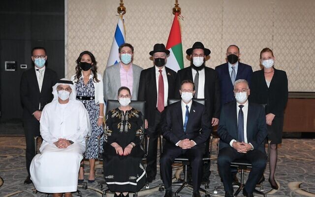 التقى الرئيس الإسرائيلي إسحاق هرتسوغ وعقيلته، خلال زيارتهما إلى أبو ظبي، بممثلي الجالية اليهودية الإماراتية. وأعرب هرتسوغ عن شكره، لولي العهد الإماراتي، الشيخ محمد بن زايد، واصفا إياه بأنه قائد جريء ومذهل، وحصلت منه على الكثير من الإلهام خلال لقائي به لبضع ساعات اليوم. كما شكر الرئيس الإسرائيلي، رئيس الوزراء السابق بنيامين نتنياهو، والرئيس الأمريكي السابق دونالد ترامب، وملك البحرين حمد بن عيسى آل خليفة على تحقيق اتفاقات إبراهيم. وأوضح أنه إلى جانب إدارة الرئيس الأمريكي جو بايدن، تعمل القيادة الإسرائيلية على توقيع اتفاقيات تطبيع مع المزيد من الدول الإسلامية. من جهته، قال الحاخام إيلي أبادي، الحاخام الكبير في المجلس اليهودي الإماراتي، في تصريح له لقد كان من المؤثر رؤية رئيس دولة إسرائيل هنا في دولة عربية لأول مرة في التاريخ. ونقل أبادي، عن هرتسوغ قوله لقادة المجتمع اليهودي، إن اجتماعه غير المقرر في القصر الخاص لمحمد بن زايد، كان دافئا للغاية وصريحا وغير رسمي. وأضاف أبادي، إنه أخبر الرئيس الإسرائيلي، كيف نعيش بشكل جيد في الإمارات العربية المتحدة، وكيف نشعر بالحماية. يذكر أنه هناك حوالي 500 يهودي في الإمارات العربية المتحدة، وفقا لتقدير أبادي. وأكد أن زيارة هرتسوغ تمنحنا شعورا بالاعتراف، وشعورا بالقبول، وشعورا بالتمثيل. إنه شعور جيد. يذكر أن هرتسوغ وزوجته، وصلا أمس إلى أبو ظبي، في أول زيارة رسمية لرئيس إسرائيلي لدولة الإمارات العربية المتحدة