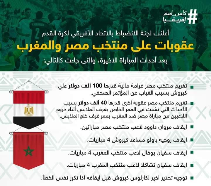 وقررت لجنة الانضباط "الكاف" توقيع غرامة مالية علي المنتخبين بجانب إيقاف مروان داوود لاعب منتخب مصر مباراتين وروجيه باولو مساعد كارلوس كيروش 4 مباريات بالإضافة إلي إيقاف سفيان بوفال لاعب منتخب المغرب مباراتين وزميله سفيان شكله مباراتين