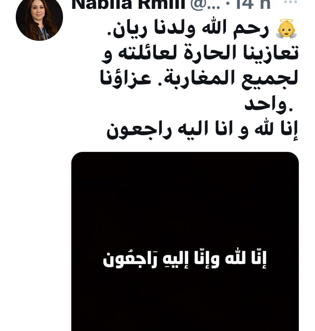 تعزية في وفاة الطفل ريان . يا أَيَّتُهَا النَّفْسُ الْمُطْمَئِنَّةُ ارْجِعِي إِلَى رَبِّكِ رَاضِيَةً مَّ رْضِيَّةً فَادْخُلِي فِي عِبَادِي وَادْخُلِي جَنَّتِي صدق الله العظيم. بقلوب خاشعة وراضية بإرادة الله وقدره، نبأ وفاة الطفل ريان . بهذه المناسبة الأليمة، نتقدم بأحر التعازي والمواساة إلى أسرته ،والى الشعب المغربي كافةً وللإنسانية جمعاء وسائلين المولى تعالى أن يتغمد الفقيد بواسع رحمته، ويرزقه الجنة ويرزق عائلته الصبر والسلوان إنا لله وإنا إليه راجعون.