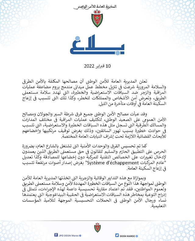 الأمن يعلن محاربة السيارات والدرجات النارية التي تصدر أصواتا مرتفعة تتسبب في إزعاج السكينة العامة