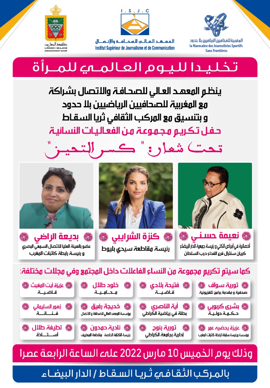 عزيز مفضال : بمناسبة اليوم العالمي للمرأة، نظم المعهد العالي للصحافة و الإتصال، بشراكة مع المغربية للصحفيين الرياضيين بلا حدود، اليوم الخميس، بقاعة ثريا السقاط بالدار البيضاء