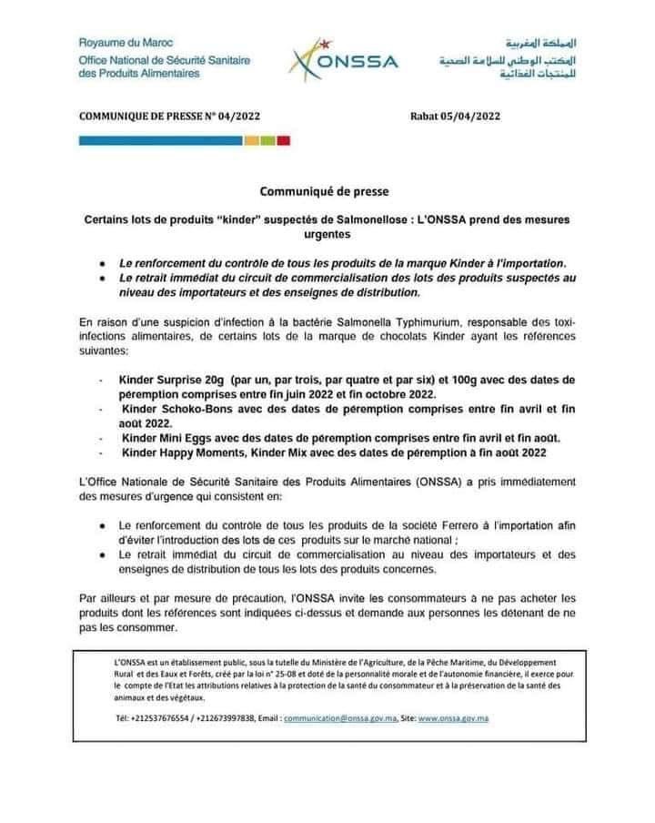 دعا المكتب الوطني للسلامة الصحية للمنتجات الغذائية (أونسا) إلى عدم اقتناء مجموعة أنواع من شوكولاتة كيندر، على خلفية أخبار تفيد باحتمال أن تكون ملوثة بـ السلامونيلا التي تسبب تسمما غذائيا، داعيا الأشخاص الذين يحتفظون بها إلى عدم تناولها. وقال المكتب إنه قام بتعزيز ضوابط الاستيراد لجميع منتجات ماركة كيندر، ويعمل على السحب الفوري من دائرة التسويق لدُفعات المنتجات المشبوهة على مستوى المستوردين وسلاسل التوزيع. وأوضح أونساأن الأمر يتعلق بكل من أنواع كيندر سوربرايز التي أوزانها ما بين 20 و100 غرام، مع تواريخ انتهاء الصلاحية بين نهاية يونيو 2022 ونهاية أكتوبر 2022، وكيندر شوكو بونس مع تواريخ انتهاء الصلاحية بين نهاية أبريل ونهاية غشت من السنة الجارية، وكيندر ميني مع تواريخ انتهاء الصلاحية بين نهاية أبريل ونهاية غشت من السنة ذاتها، وكيندر هابي مومنت وكيندر ميكس التي تاريخ صلاحيتها حتى غشت المقبل. وأورد المكتب، الذي يسهر على تطبيق سياسة الحكومة في مجال السلامة الصحية للنباتات والحيوانات والمنتجات الغذائية بدءا من المواد الأولية وصولا إلى المستهلك النهائي، إنه يدعو، كتدبير احترازي، المستهلكين إلى عدم شراء المنتجات المشار إليها أعلاه ويطلب من الأشخاص الذين يحتفظون بها عدم استهلاكها. وأفاد المكتب التابع لوزارة الفلاحة والصيد البحري والتنمية القروية والمياه والغابات بأنه سيعمل على تعزيز الرقابة على جميع منتجات مجموعة فريرو عند الاستيراد، لتجنب إدخال دفعات من هذه المنتجات إلى السوق الوطنية. وتعمل مجموعة فريريو، منذ الاثنين، على سحب كل منتجات بيضة كيندر وأنواع من شوكولاتة كيندر من الأسواق الأوروبية والبريطانية لاكتشاف أنها ملوثة بـ السلامونيلا التي تسبب تسمما غذائيا. وأعلنت فريريو عن سحب منتجات كيندر التي تصنع ببلجيكا، وخاصة تلك التي تواريخ صلاحيتها بين يونيو وأكتوبر 2022، على احتمال أن تكون ملوثة بـ السالمونيلا التي تسبب تسمما غذائيا ينتج عنه اضطرابات في الجهاز الهضمي غالبا ما تصاحبها حمى خلال 48 ساعة من تناول المنتجات الملوثة. وقد تتفاقم هذه الأعراض عند الأطفال الصغار والأشخاص الذين يعانون من نقص المناعة والنساء الحوامل وكبار السن