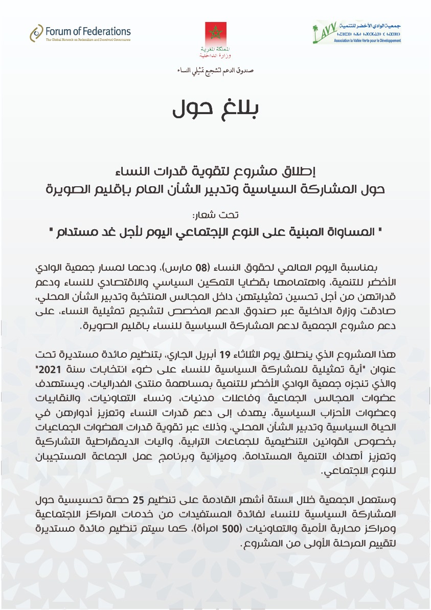 تحت شعار المساواة المبنية على النوع الاجتماعي اليوم لاجل غد مستدام                                 وبمناسبة اليوم العالمي لحقوق النساء (08 مارس)، ودعما لمسار جمعية الوادي الأخضر للتنمية، واهتمامها بقضايا التمكين السياسي والاقتصادي للنساء ودعم قدراتهن من أجل تحسين تمثيليتهن داخل المجالس المنتخبة وتدبير الشأن المحلي، صادقت وزارة الداخلية عبر صندوق الدعم المخصص لتشجيع تمثيلية النساء، على دعم مشروع الجمعية لدعم المشاركة السياسية للنساء باقليم الصويرة