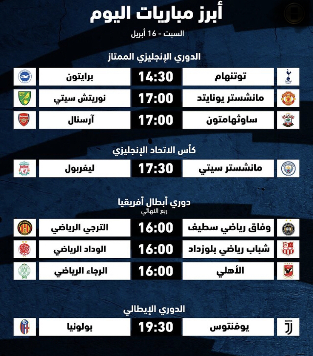 تقام اليوم، السبت، العديد من المباريات القوية على مستوى الكرة الإفريقية والعالمية، إذ تشتعل المنافسة بين مانشستر سيتي وليفربول، في نصف نهائي كأس إنجلترا، وتستمر المتعة بمواجهات قوية في ربع نهائي دوري أبطال إفريقيا، الذي تأهل له 6 أندية عربية، حيث يلتقي الأهلي مع الرجاء البيضاوي بالتوفيق للرجاويين ، كما يشهد اليوم، استمرار الإثارة في الدوريات الخمس الكبرى، وعلى رأسها الدوري الإنجليزي والدوري الإسباني والدوري الإيطالي، وذلك مع اشتداد المنافسة على اللقب. وفيما يلي توقيت اللقاءات القوية المبرمجة لنهار اليوم ، كأس الاتحاد الإنجليزي - نصف النهائي مانشستر سيتي - ليفربول - 4:30 - دوري أبطال إفريقيا - ذهاب ربع النهائي بترو أتلتيكو ضد صن داونز - 6:30 الأهلي ضد الرجاء المغربي - 10:00 - شباب بلوزداد ضد الوداد المغربي - 11:00 - الدوري الإنجليزي - الجولة 33 توتنهام ضد برايتون - 1:30 - مانشستر يونايتد ضد نوريتش سيتي - 4:00 - ساوثامبتون ضد آرسنال - 4:00 - واتفورد ضد برينتفورد - 4:00 - الدوري الإسباني - الجولة 32 إلتشي ضد ريال مايوركا - 2:00 - ألافيس ضد رايو فاييكانو- 4:15 - فالنسيا ضد أوساسونا - 6:30 - خيتافي ضد فياريال - 9:00 - الدوري الإيطالي- الجولة 33 كالياري ضد ساسوولو - 12:30 - سامبدوريا ضد ساليرنيتانا - 2:30 - أودينيزي ضد إمبولي - 2:30 - فيورنتينا ضد فينيسيا - 2:30 - يوفنتوس ضد بولونيا - 6:30 - لاتسيو ضد تورينو - 8:45 - الدوري الألماني - الجولة 30 أوجسبورج ضد هيرتا برلين - 3:30 - ماينز ضد شتوتجارت - 3:30 - فرايبورج ضد بوخوم - 3:30 - بوروسيا دورتموند ضد فولفسبورج - 3:30 - بوروسيا مونشنجلادباخ ضد كولن - 6:30 -الدوري الفرنسي - الجولة 32 سانت إيتيان ضد بريست - 5:00 - ليل ضد لانس - 9:00