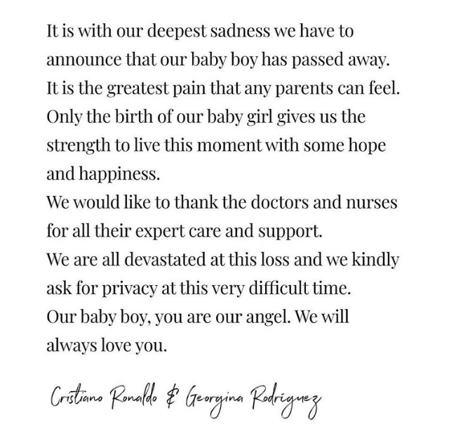 أعلن اللاعب الدولي البرتغالي كريستيانو رونالدو، مهاجم الفريق الأول لكرة القدم بنادي مانشستر يونايتد الإنجليزي، مساء يوم الاثنين، عن وفاة ابنه أحد توأميه حديثي الولادة، وذلك في منشور عبر حسابه على موقع تداول الصور والفيديوهات انستجرام. وكتب رونالدو: ببالغ الحزن نعلن وفاة رضيعنا، إنه أكبر ألم يمكن أن يشعر به أي والد. وتابع: فقط ولادة طفلتنا تمنحنا القوة لنعيش هذه اللحظة ببعض الأمل والسعادة، نود أن نشكر الأطباء والممرضات على كل الرعاية والدعم المقدمين. واختتم رونالدو: لقد دُمرنا ونطالب بالخصوصية في هذا الوقت الصعب للغاية، ولدنا أنت ملاكنا، سنحبك للأبد