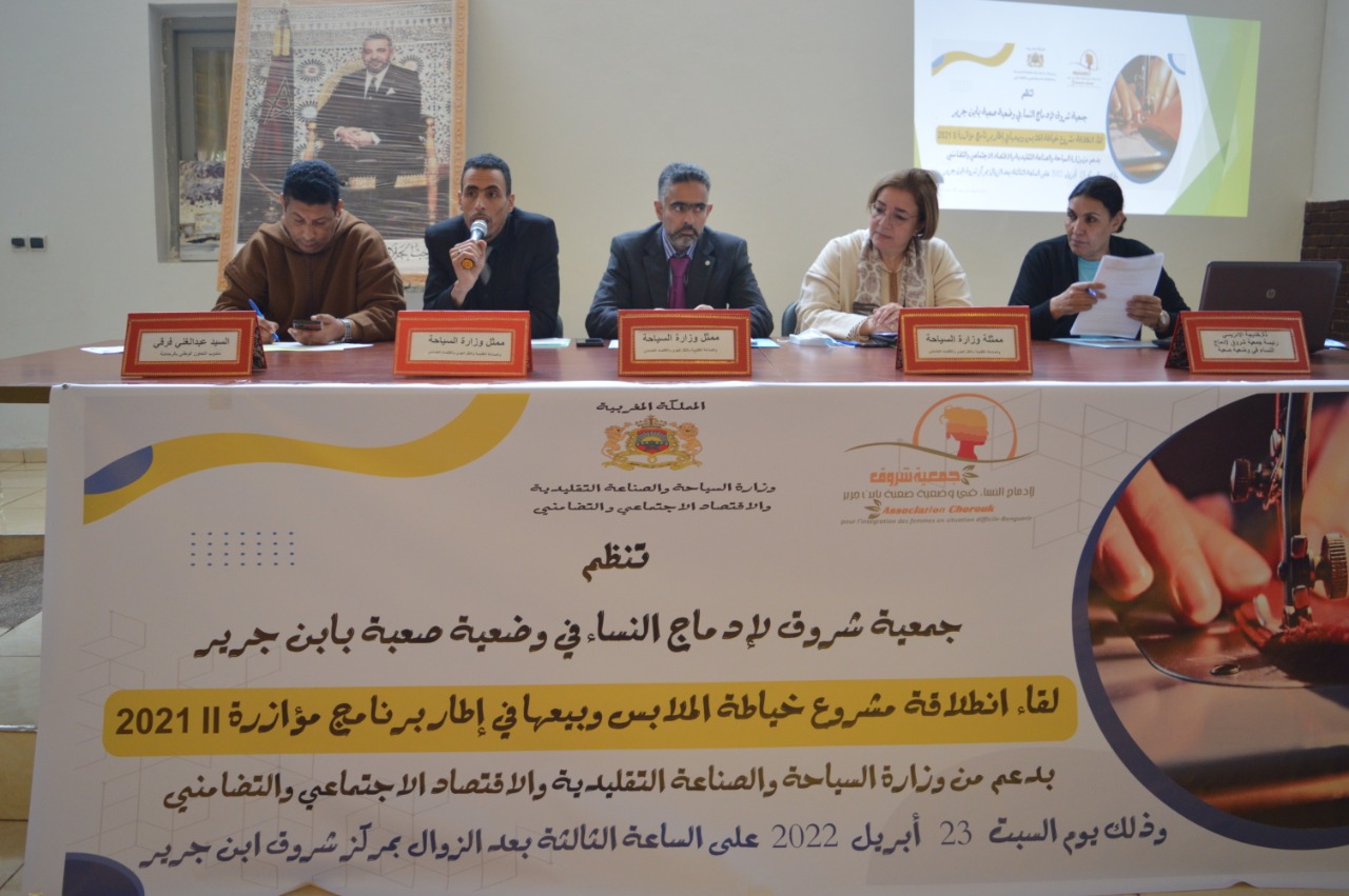 زوال امس السبت 21 رمضان 1443 هجرية الموافق ل 23 ابريل 2022 ميلادية بفضاء شروق المتعدد الوظائف للنساء بالرحامنة،اعطاء انطلاقة مشروع الخياطة والفصالة بشراكة مع وزارة السياحة والصناعة التقليدية والاقتصاد الاجتماعي والتضامن ،وذلك بحضور كل من: ممثلي الوزارة الشريك الرئيسي في هذا المشروع، المدير الاقليمي للتعاون الوطني بالرحامنة ،المدير الاقليمي للصناعة التقليدية ورئيسة جمعية شروق لادماج النساء في وضعية صعبة بابن جرير الأستاذة خديجة الادريسي وعدد من مسؤولي الجمعية والطاقم الاداري لها،وعدد من رئيسات مجموعة من التعاونيات النسائية وفعاليات المجتمع المدني والمستفيدات من هذا المشروع