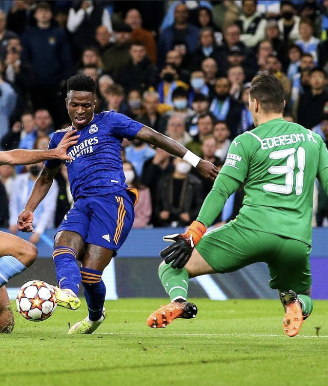 حافظ ريال مدريد الإسباني على حظوظه بالتأهل إلى نهائي دوري أبطال أوروبا، رغم خسارته في مباراة مثيرة بذهاب نصف النهائي أمام مضيفه مانشستر سيتي الإنجليزي بنتيجة 4-3. وتقدم سيتي بهدفين في أول 11 دقيقة عن طريق ضربة رأس من كيفن دي بروين وتسديدة غابرييل جيسوس. وقلص كريم بنزيمة الفارق لريال في الدقيقة 33، ثم أعاد فيل فودن فارق الهدفين لأصحاب الأرض في الدقيقة 53. لكن بعد دقيقتين فقط، انطلق فينيسيوس جونيور من الجانب الأيسر وتوغل بسرعة داخل منطقة الجزاء وقلص الفارق من جديد. وأطلق برناردو سيلفا تسديدة قوية ليعزز تقدم سيتي في الدقيقة 74، لكن بنزيمة أحرز هدفه الشخصي الثاني من ركلة جزاء قبل 8 دقائق من نهاية الوقت الأصلي. ورغم الفوز برباعية، فقد يشعر سيتي بالحسرة على إهدار عدد كبيرمن الفرص على مدار الشوطين. وتقام مباراة الإياب في مدريد الأربعاء المقبل. وسيلعب ليفربول الإنجليزي مع فياريال الإسباني في المباراة الأخرى بذهاب قبل النهائي في أنفيلدالأربعاء.