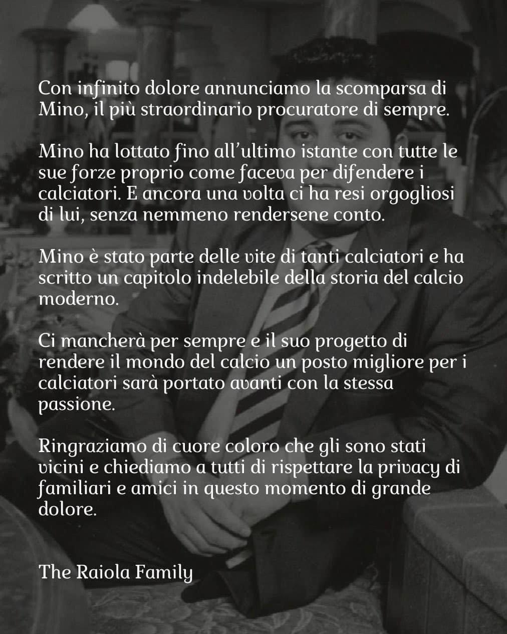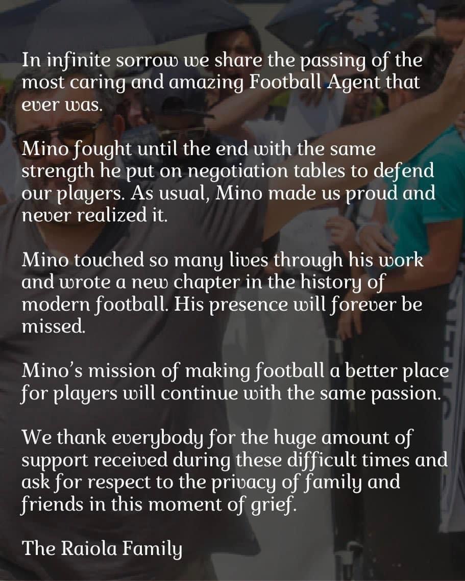 أعلنت أسرة مينو رايولا، أحد أشهر وكلاء لاعبي كرة القدم على الإطلاق، وفاته اليوم السبت عن عمر يناهز 54 عاما بعد صراع مع المرض. وكتبت الأسرة في حساب رايولا على تويتر ببالغ الحزن، ننعى وفاة أكثر وكلاء كرة القدم رعاية للآخرين وأفضلهم على الإطلاق. وأضافت الأسرة قاتل مينو حتى النهاية بالقوة نفسها التي كان يستخدمها في المفاوضات للدفاع عن لاعبيه. كما جرت العادة، جعلنا مينو نشعر بالفخر. وأشار البيان مهمة مينو في جعل كرة القدم مكانا أفضل للاعبين ستستمر بنفس الشغف. وختم البيان نشكر الجميع على القدر الهائل من الدعم الذي تلقيناه خلال هذه الأوقات الصعبة ونطالب باحترام خصوصية العائلة والأصدقاء في لحظات الحزن هذه.