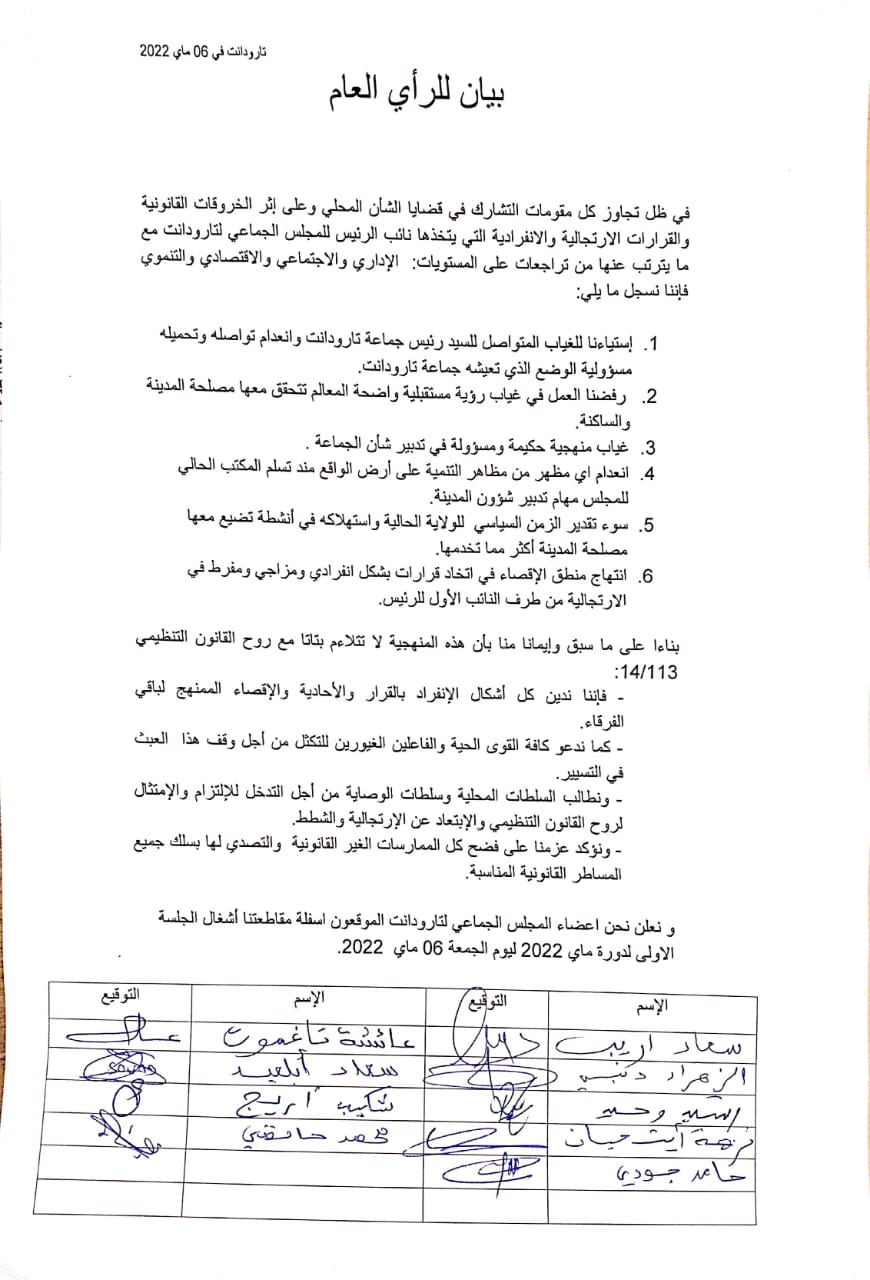 و نعلن نحن اعضاء المجلس الجماعي لتارودانت الموقعون اسفلة مقاطعتنا أشغال الجلسة الاولى لدورة ماي 2022 ليوم الجمعة 06 ماي 2022.