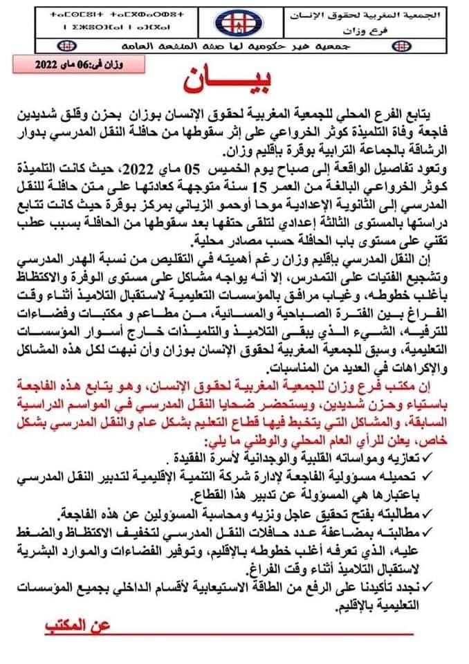 وزان:وفاة تلميذة بعد سقوطها من سيارة النقل المدرسي