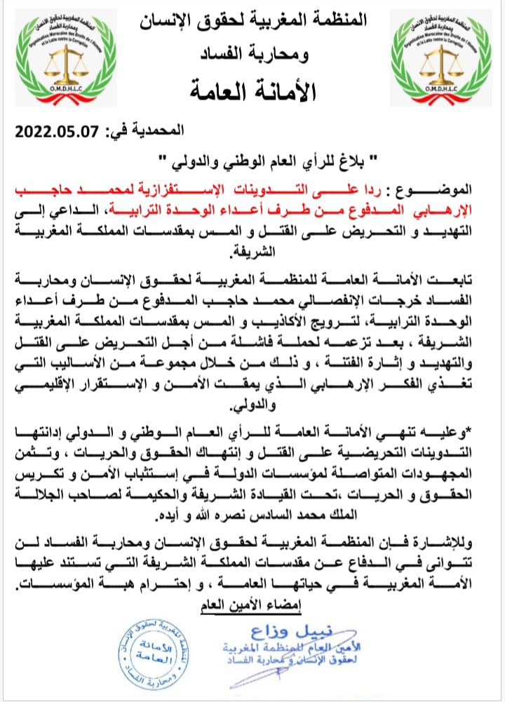 بلاغ :رداً على التدوينات الإستفزازية لمحمد حاجب الإرهابي المدفوع من طرف أعداء الوحدة الترابية