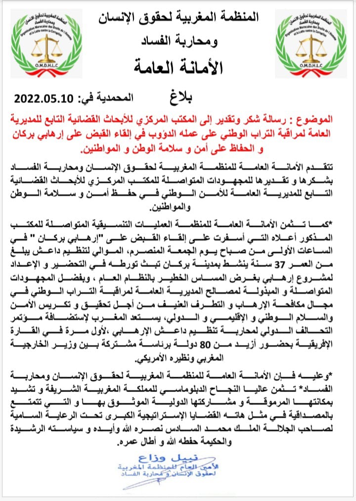 الموضوع: رسالة شكر وتقدير إلى المكتب المركزي للأبحاث القضائية التابع للمديرية العامة لمراقبة التراب الوطني على عمله الدؤوب في إلقاء القبض على إرهابي بركان و الحفاظ على أمن و سلامة الوطن و المواطنين. تتقدم الأمانة العامة للمنظمة المغربية لحقوق الإنسان ومحاربة الفساد بشكرها و تقديرها للمجهودات المتواصلة للمكتب المركزي للأبحاث القضائية التابع للمديرية العامة للأمن الوطني في حفظ أمن و سلامة الوطن و المواطنين. كما تثمن الأمانة العامة للمنظمة العمليات التنسيقية المتواصلة للمكتب المذكور أعلاه التي أسفرت على إلقاء القبض على إرهابي بركان في الساعات الأولى من صباح يوم الجمعة المنصرم، الموالي لتنظيم داعش يبلغ من العمر 37 سنة ينشط بمدينة بركان تبث تورطه في التحضير و الإعداد لمشروع إرهابي بغرض المساس الخطير بالنظام العام. وبفضل المجهودات المتواصلة و المبذولة لمصالح المديرية العامة لمراقبة التراب الوطني في مجال مكافحة الإرهاب و التطرف العنيف من أجل تحقيق و تكريس الأمن و السلام الوطني و الإقليمي و الدولي، يستعد المغرب لإستضافة مؤتمر التحالف الدولي لمحاربة تنظيم داعش الإرهابي ،لأول مرة في القارة الإفريقية بحضور أزيد من 80 دولة برئاسة مشتركة بين وزير الخارجية المغربي ونظيره الأمريكي. وعليه فإن الأمانة العامة للمنظمة المغربية لحقوق الإنسان ومحاربة الفساد ، تثمن عاليا النجاح الدبلوماسي للمملكة المغربية الشريفة و تشيد بمكانتها المرموقة و مشاركتها الدولية الموثوق بها و التي تتمتع بالمصداقية في مثل هاته القضايا الإستراتيجية الكبرى تحت الرعاية السامية لصاحب الجلالة الملك محمد السادس نصره الله وأيده و سياسته الرشيدة و الحكيمة حفطه الله و أطال عمره. إمضاء نبيل وزاع الأمين العام للمنظمة المغربية لحقوق الإنسان ومحاربة الفساد.