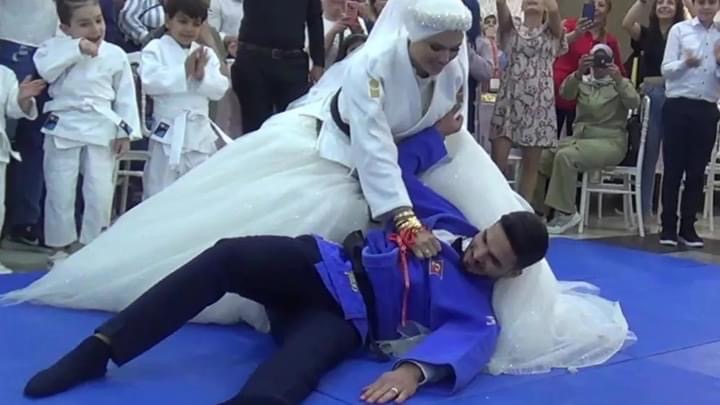 أصر الزوجان على الإحتفال بزواجهما بحركات من الرياضة التي يعشقونها معاً ،ففضلا أن يزفا في حلبة للمصارعة ، ودخل العروسين طلحة أنيس أريوغلو 23 عاما، وعمران شابال 23 عاما، حفل زفافهما يرتدي كلا منهما الزي الرياضي للعبة الجودو فوق ملابس الزفاف. وفور الدخول، شرع العروسين بمباراة استعراضية، حيث تمكنت العروس من طرح العريس أرضا، خلال أربعة حركات متنوعة، فيما تم بعد ذلك إتمام عقد الزواج.