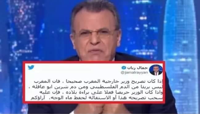 عاد من جديد مقدم الأخبار والصحفي الفلسطيني بقناة الجزيرة القطرية، جمال ريان، لنفث سمومه من جديد ضد المغاربة، حيث استغل هذه المرة مأساة مقتل الصحفية الفلسطينية شيرين أبوعاقلة. ونشر ريان فيديو قصير لوزير الخارجية المغربي ناصر بوريطة، على حسابه الرسمي بتويتر، وعلق عليه بالقول: إذا كان تصريح وزير خارجية المغرب صحيحا، فان المغرب ليس بريئا من الدم الفلسطيني ومن دم شرين أبو عاقلة، وإذا كان الوزير حريصا فعلا على براءة بلاده، فإن عليه سحب تصريحه هذا أو الاستقالة لحفظ ماء الوجه. ورد أحد المغردين، على تغريدة ريان بالقول: ليس لدينا أي عقدة مع مغاربتنا اليهود بل وأضيف، أغلب المغاربة يحنون إلى الزمن الذي كان فيه المغرب مزيجا رائعا من الثقافات والديانات. ولا عزاء للحاقدين. هذا واختار آخر نشر بيان يظهر أكثر الدول الداعمة للشعب الفلسطيني ماديا، و يأتي المغرب في مقدمتها.