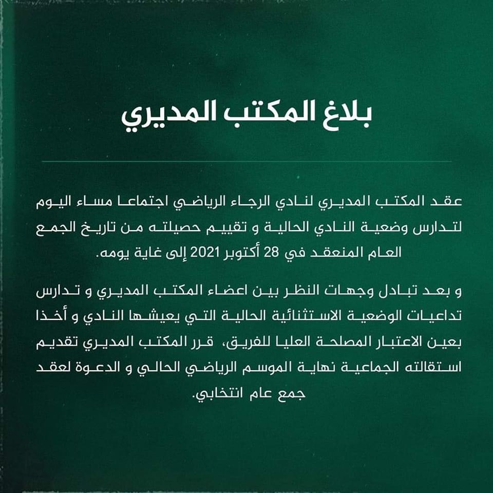 زلزال ذلك الذي ضرب فريق الرجاء البيضاوي، على بعد دورات من نهاية الموسم الكروي، عندما أعلن المكتب المسير عن إستقالته الجماعية غداة الديربي الكلاسيكي بين الوداد والرجاء. وإعلن المكتب المسير لفريق الرجاء البيضاوي، قبل لحظات في بلاغ رسمي حصل موقع الدولية للاعلام على نسخة منه، عن إستقالته الجماعية. وأوضح مكتب الرجاء البيضاوي، أنه سيواصل تدبير مهام الفريق إلى نهاية الموسم، ليقدم إستقالته الجامعية في جمع عام إستثنائي. وخرج فريق الرجاء البيضاوي، هذا الموسم خاوي الوفاض من حيث الألقاب، ما جر عليه غضب جماهير الفريق الأخضر. وحصد الرجاء البيضاوي، هزيمة قبل لقاء الديربي نهاية الاسبوع الجاري أمام الوداد البيضاوي. فاز وجاء قرار مكتب الرجاء، عقب إنتصار فريق سريع وادي زم على عليه الفريق البيضاوي بهدف دون رد ، في المباراة التي جمعتهما ، الأحد ، على أرضية ملعب الفوسفاط بخريبكة، برسم الدورة ال 24 من البطولة الوطنية الاحترافية إنوي لكرة القدم.