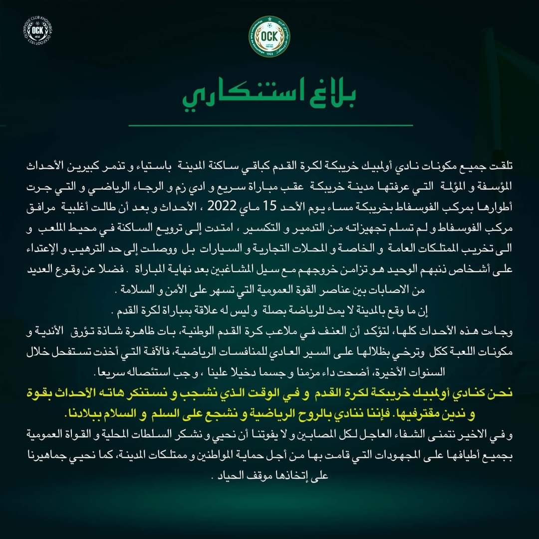 على إثر أعمال الشغب والعنف عقب نهاية مباراة الجولة 24 بين سريع وادي زم وضيفه الرجاء البيضاوي والتي طالت غالبية مرافق ملعب الفوسفاط بخريبكة قبل أن تمتد إلى محيط الملعب والاماكن المجاورة حيث روعت الساكنة اضافة إلى وقوع تخريب للممتلكات الخاصة والعامة وغير ذلك من أعمال البلطجة والعنف، اصدر نادي أولمبيك خريبكة بلاغا استنكاريا شجب وندد من خلاله بتلك الاعمال الهمجية ومقترفيها والتي لاتمت للروح الرياضية بصلة.. يذكر أن الرجاء البيضاوي كان مني بالهزيمة بهدف نظيف امام فريق سريع وادي زم المتذيل للترتيب