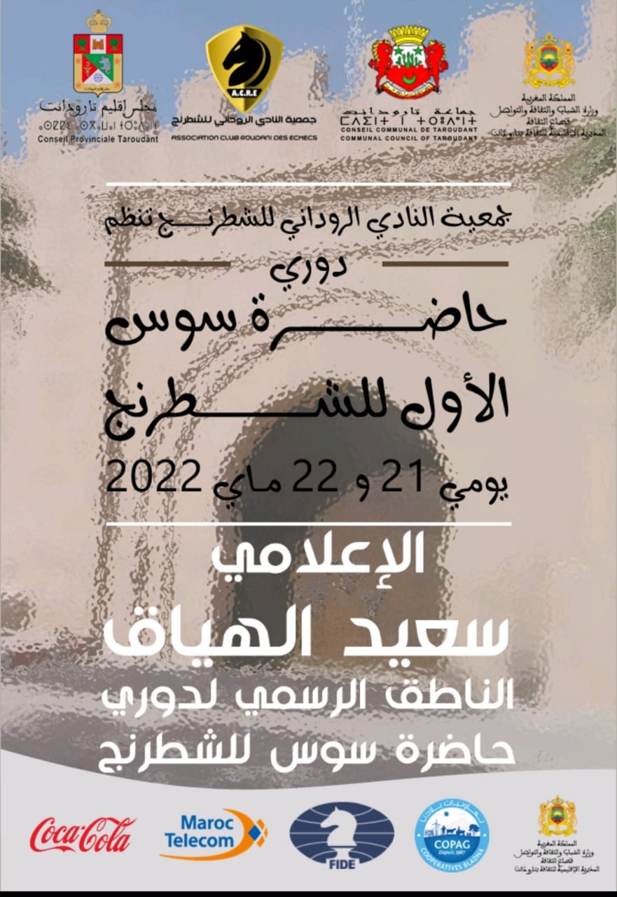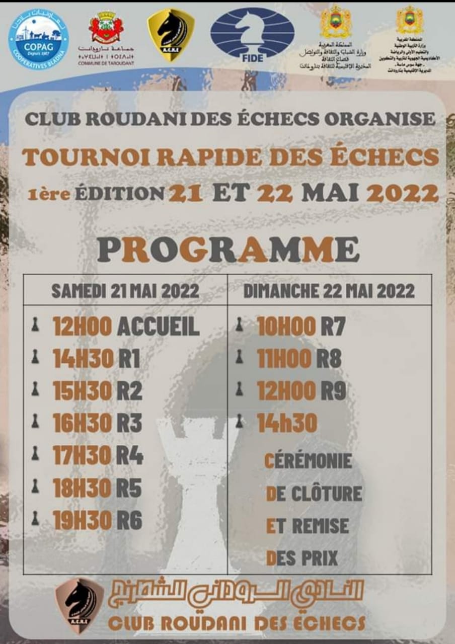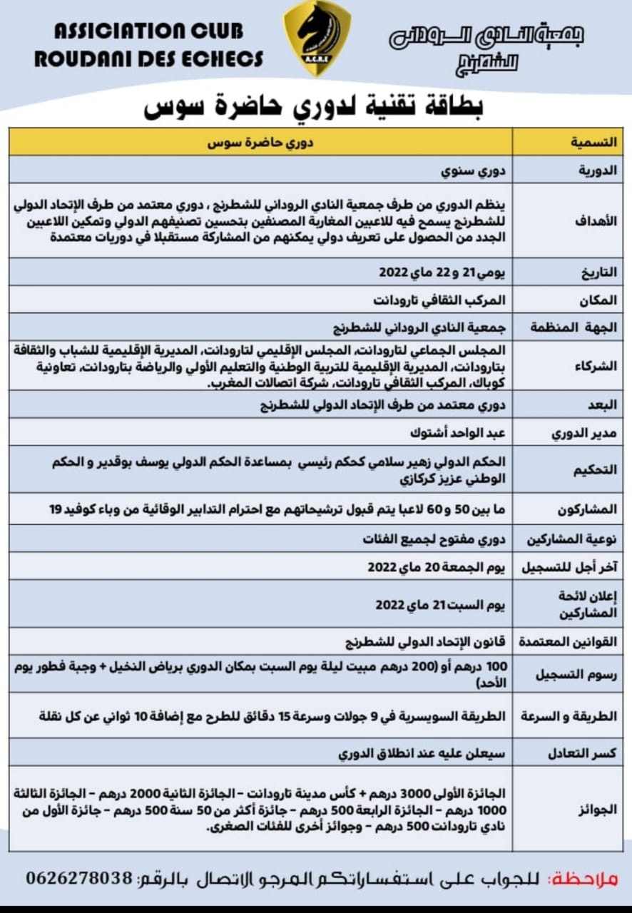 جمعية النادي الروداني الشطرنج ينظم دوري حاضرة سوس الاول الشطرنج يومي 21 و 22 مايو الجاري .