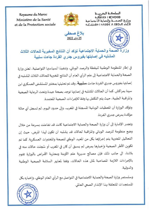 صرح خالد آيت الطالب، وزير الصحة والحماية الاجتماعية، أن نتائج الاختبار الذي أجري على الحالات الثلاث المشتبه بإصابتها بجدري القرود ظهرت سلبية. وتوزعت الحالات الثلاث المشتبه بإصابتها بجدري القرود على حالة واحدة بكل من الدار البيضاء، وبني ملال، وعين حرودة، وأكد وزير الصحة والحماية الاجتماعية في تصريحه ،أن بلادنا خالية إلى حد الساعة من هذا الفيروس، ولا داعي للقلق، مشيرا إلى أن هناك تشابها بين جدري القرود وبين أمراض أخرى كبوشويكة. ولفت المسؤول الحكومي سالف الذكر إلى أن جدري القرود، الذي ينتمي لعائلة الفيروسات نفسها المسببة للإصابة بمرض الجدري المعروف، لا يدعو إلى القلق، حسب المعطيات التي قدمتها منظمة الصحة العالمية.