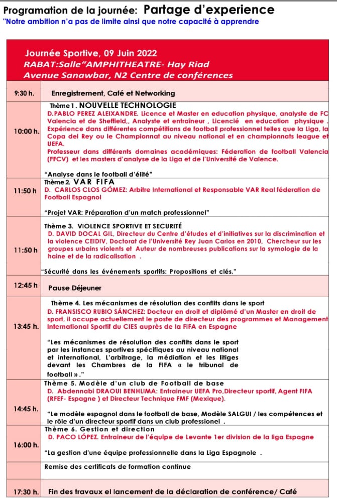 في إطار برنامجه السنوي وسيرا على مجهودات بلادنا في إطار الديبلوماسية الموازية ، ينظم اتحاد الصحفيين الرياضيين المغاربة الملتقى الدولي الاول للحد من ظاهرة الشغب الرياضي والاستفادة من الخبرات الأجنبية للحد من هذه الظاهرة ، بحضور كبار الدكاترة والباحثين الإسبان كل في مجال اختصاصه ، إسبانيا كنموذج ، بالإضافة إلى مواضيع أخرى جد هامة ، ومنها التحكيم وتقنيات الفيديو (الڤار) ، و التيكنولوجيا الحديثة في مجال التحليل الرياضي ، والوساطة والنزاعات القانونية لدى الفيفا ، والتدريب والتكوين الاحترافي الحديث ، وذلك بشراكة مع الجامعة الملكية المغربية لكرة القدم واللجنة الوطنية الأولمبية المغربية ، واللجنة العليا للمشاريع والإرث القطرية وسيكون مركز الاستقبال والندوات التابع لوزارة التجهيز والماء ، الكائن بشارع الصنوبر ، بحي الرياض العاصمة الرباط مسرحا لهذا الحدث الدولي الهام الذي يرمز إلى تبادل الخبرات بين المغرب وإسبانيا وفق البرنامج المسطر كما سيعرف هذا الملتقى فقرة خاصة بإستعراض أهم البنيات التحتية التي تزخر بها قطر خاصة على مستوى الملاعب العملاقة التي ستحتضن نهائيات كأس العالم بقطر خلال شهري نونبر ودجنبر القادمين وذلك يوم الخميس القادم التاسع من يونيو الجاري على الساعة التاسعة والنصف صباحا
