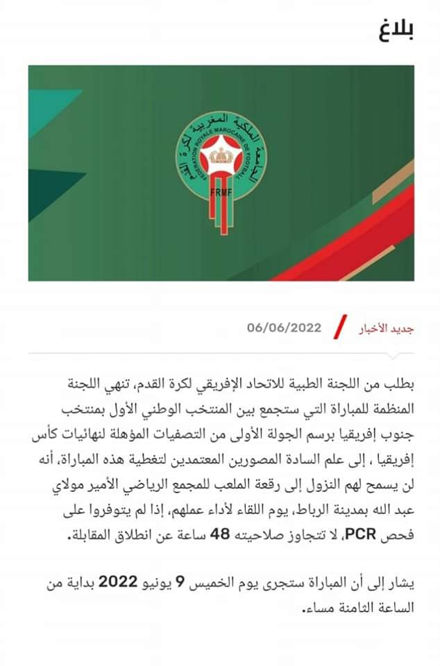 تنهي اللجنة المنظمة للمبارة التي ستجمع بين المنتخب المغربي للكبار مع منتخب جنوب افريقيا ،برسم الجولة الأولى من التصفيات المؤهلة لنهائيات كأس افريقيا للامم ،وبطلب من اللجنة الطبية للإتحاد الإفريقي لكرة القدم إلى علم السادة المصورين المعتمدين لتغطية هذه المبارة ،أنه لن يسمح لهم النزول الى رقعة الملعب للمجمع الرياضي الأمير مولاي عبد الله بالرباط ،يوم اللقاء لأداء عملهم إذا لم يتوفروا على فحص ،لا تتجاوز صلاحيته مدة 48 ساعة عن انطلاق المقابلة ،وللتذكير المقابلة ستجرى يوم الخميس 09-يونيو بدايةً من الساعة الثامنة مساءاً