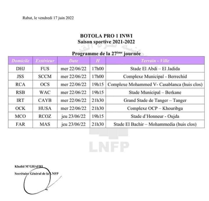 ستجري يوم الأربعاء والخميس 22-23 يونيو منافسات البطولة الوطنية الإحترافية في قسمها الأول بإجراء الجولة 27 ، والتي ستشهد مباريات مهمة ومصيرية على صعيد المقدمة ، من بينها مبارة نهضة بركان والوداد الرياضي، والجيش الملكي أمام ضيفه المغرب الفاسي، أما على مستوى أسفل الترتيب فهناك قمة حارقة بين مولودية وجدة وسريع وادي زم، وكذالك مبارة فريقي إتحاد طنجة ويوسفية برشيد. وسيكون برنامج الجولة 27 من البطولة الوطنية الإحترافية على الشكل التالي: الأربعاء 22 يونيو 2022
