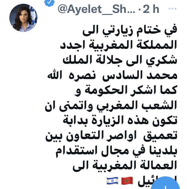 انتهت زيارة وزيرة الداخلية الإسرائيلية السيدة أييليت شاكيد، التي قامت بزيارة رسمية إلى المغرب ،حيث استقبلها وزير الداخلية الفتيت و عقدت سلسلة لقاءات مع وزير الداخلية ووزير الخارجية، ووزيرة، الاقتصاد ومسؤولين كبار في المملكة المغربية، كما أن الوزيرة تدارست مع نظرائها المغاربة نقل اليد العاملة المغربية للعمل في إسرائيل في قطاعات البناء والتمريض وغيرها من المجالات ،وفي ختام زيارتيها للمملكة المغربية جددت شكرها الى جلالة الملك محمد السادس نصره الله كما شكرت الحكومة و الشعب المغربي ،وتمنت ان تكون هذه الزيارة بدابة تعميق اواصر التعاون بين بلدينا في مجال استقدام العمالة المغربية الى اسرائيل.