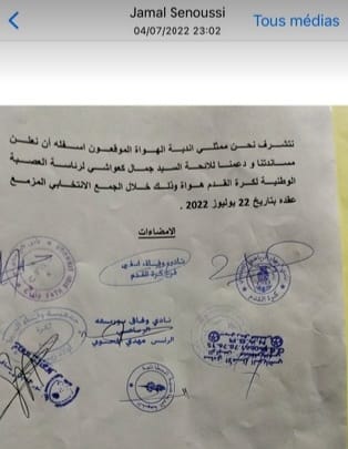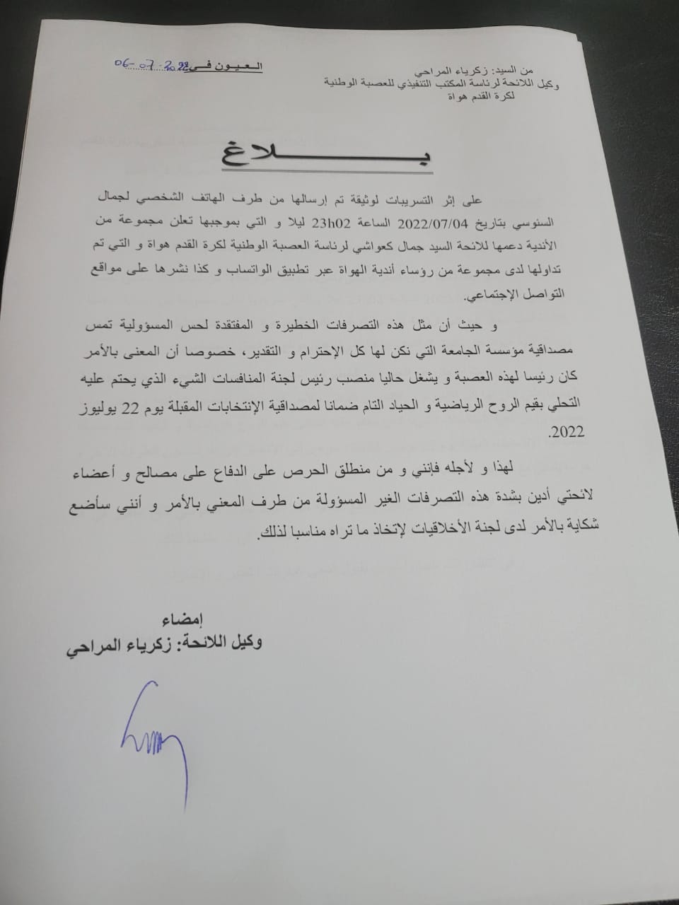 وجاء في البلاغ الذي توصل الموقع بنسخة منه انه وعلى إثر التسريبات التي إنتشرت من الهاتف الشخصي للسيد جمال السنوسي بتاريخ 04/07/2022 على الساعة الحادية عشر و دقيقتين ليلا ،والتي تتضمن خبر دعم السيد "جمال كعواشي" لرئاسة عصبة الهواة وهو ما يتنافى و دور العضو الجامعي المذكور الذي يستوجب عليه الحفاظ على مسافة واحدة بين جميع المرشحين.