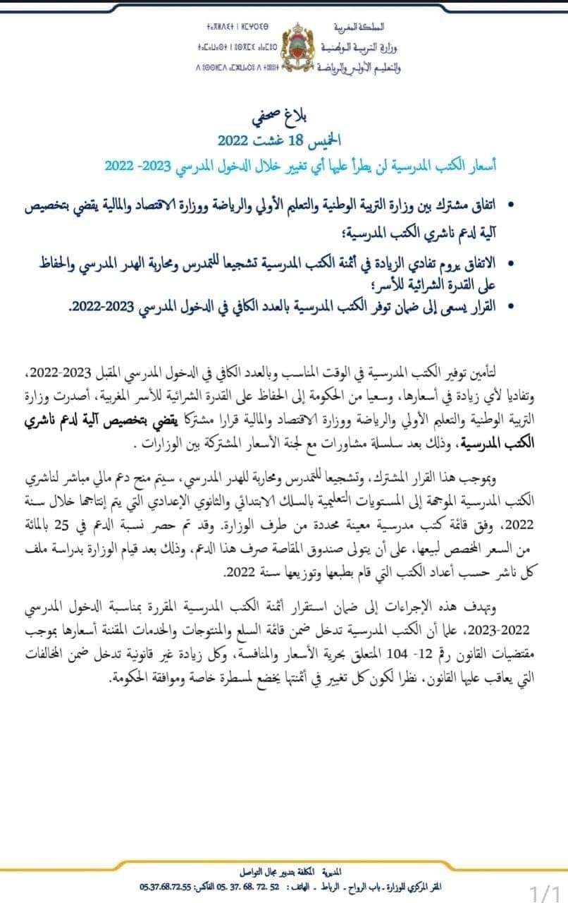 قالت وزارة التربية الوطنية والتعليم الأولي إن أسعار الكتب المدرسية لن يطرأ عليها أي تغيير خلال الدخول المدرسي 2023- 2022، وذلك بعد اتفاق مشترك بينها وبين ووزارة الاقتصاد والمالية يقضي بتخصيص آلية لدعم ناشري المقررات. واوضحت الوزارة في بلاغ اليوم الخميس 18 غشت، أن الاتفاق يروم تفادي الزيادة في أثمنة الكتب المدرسية تشجيعا للتمدرس ومحاربة الهدر المدرسي والحفاظ على القدرة الشرائية للأسر، مبرزة أن القرار يسعى إلى ضمان توفر الكتب المدرسية بالعدد الكافي في الدخول المدرسي 2023-2022. وقال المصدر ذاته، إنه ولتأمين توفير الكتب المدرسية في الوقت المناسب وبالعدد الكافي في الدخول المدرسي المقبل 2023-2022، وتفاديا لأي زيادة في أسعارها، وسعيا من الحكومة إلى الحفاظ على القدرة الشرائية للأسر المغربية، أصدرت وزارة التربية الوطنية والتعليم الأولي والرياضة ووزارة الاقتصاد والمالية قرارا مشتركا يقضي بتخصيص آلية لدعم ناشري الكتب المدرسية، وذلك بعد سلسلة مشاورات مع لجنة الأسعار المشتركة بين الوزارات. وأردفت الوزارة وبموجب هذا القرار المشترك، وتشجيعا للتمدرس ومحاربة للهدر المدرسي، سيتم منح دعم مالي مباشر لناشري الكتب المدرسية الموجهة إلى المستويات التعليمية بالسلك الابتدائي والثانوي الإعدادي التي يتم إنتاجها خلال سنة 2022، وفق قائمة كتب مدرسية معينة محددة من طرف الوزارة. وقد تم حصر نسبة الدعم في 25 بالمائة من السعر المخصص لبيعها، على أن يتولى صندوق المقاصة صرف هذا الدعم، وذلك بعد دراسة ملف كل ناشر من طرف الوزارة حسب أعداد الكتب التي قام بطبعها وتوزيعها سنة 2022. واوضحت الوزارة، وفق البلاغ، أن هذه هذه الإجراءات تهدف إلى ضمان استقرار أثمنة الكتب المدرسية المقررة بمناسبة الدخول المدرسي 2023-2022، مشددة على أن الكتب المدرسية تدخل ضمن قائمة السلع والمنتوجات والخدمات المقننة أسعارها بموجب مقتضيات القانون رقم 12- 104 المتعلق بحرية الأسعار والمنافسة، وكل زيادة غير قانونية تدخل ضمن المخالفات التي يعاقب عليها القانون، نظرا لكون كل تغيير في أثمنتها يخضع لمسطرة خاصة وموافقة الحكومة.