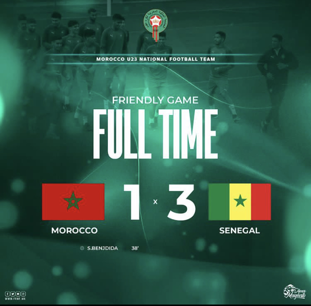 تلقى المنتخب الوطني المغربي لأقل من 23 سنة هزيمة أخرى أمام نظيره السينغالي بـ3 أهداف لـ1، في مباراة ودية جمعتهما، الأحد 25 شتنبر 2022، في ملعب مجمع الأمير مولاي عبد الله بالرباط، في إطار استعدادات المنتخبين لبطولة إفريقيا المؤهلة للألعاب الأولمبية. وتعد الهزيمة الثانية على التوالي للمنتخب أمام نظيره السينغالي. حيث كانت الأولى بنتيجة 4 أهداف لـ0 في يوم الخميس 22 شتنبر، فهل ستكون هذه الهزيمة سببًا للإستغناء عن المدرب عموتة والبحث عن مدرب أجنبي يكون عونا للقجع في تنفيد البرنامج الذي سطره لتكون المنتخبات الوطنية هي قافلة المنتخبات الإفريقية