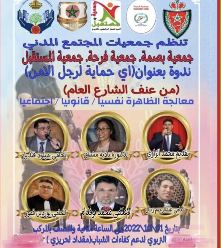 تنظم جمعيات مدنية ندوة تحت عنوان : ( اي حماية لرجل الأمن من عنف الشارع ) معالجة الظاهرة من الناحية الإنسانية -القانونية -النفسية - الإعلامية بتاريخ 01102022 على الساعة الثانية والنصف بالمركب التربوي لدعم كفاءات الشباب مقداد لحريزي ،وذالك لتنديد بما تعرض له رجال الأمن من إعتداءات جسدية وترهيب نفسي وحوادث سير متعمدة كما وقع مؤخراً،وذالك كله بسبب الاستعراض بدرجاتهم معرضين حياتهم وحياة الآخرين للخطر ،وأثارت مقاطع هذه الفيديوهات والصور إشمئزاز أطياف المجتمع،لكون الأمر أصبح خطيرًا وقد يصل الى ما لا تحمد عقباه،عندما يصبح الإعتداء على الأمن نهجاً للجيل الحالي ، وأثارت هذه الوقائع تساؤلات كثيرة عن هيبة رجال الأمن، في ظل ازدياد حالات الاعتداءات عليهم، لهذا نضمت هذه الندوة لنأكد لرجال الأمن الوطني أن الوقوف بجانبهم والتنديد بهذه الأفعال المسيئة لسمعة رجال الأمن وللمواطنين عامةً ،أقل ما تقدمه هذه الجمعيات إتجاه رجال الأمن ،وسيناقش في هذه الندوة كيفية مواجهة هذه الإعتداءات من الناحية القانونية والإنسانية والنفسية ،تحت اشراف اساتذة ومحامون وفاعلون وجمعويون.