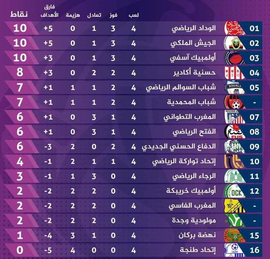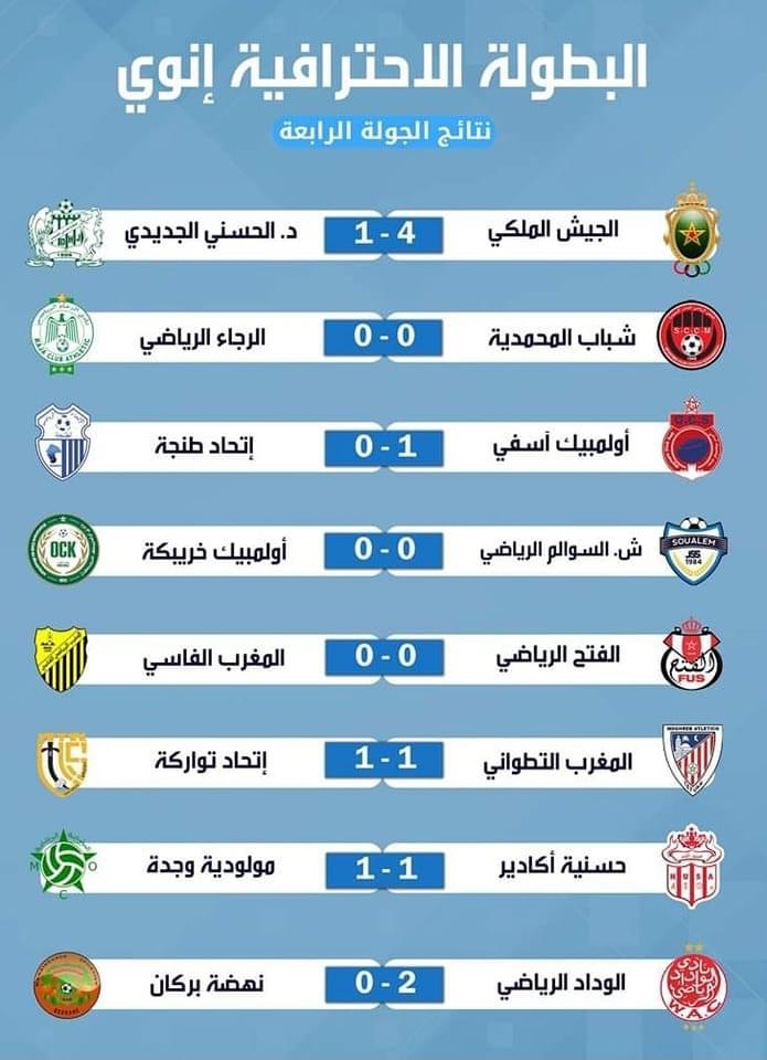 إنتصر فريق الوداد الرياضي على ضيفه نهضة بركان بهدفين دون رد، في المباراة التي جمعتهما ، اليوم الأحد على أرضية المركب الرياضي محمد الخامس بالدارالبيضاء ، برسم منافسات الدورة الرابعة من البطولة الوطنية الاحترافية إنوي لكرة القدم. وحسم فريق الوداد الرياضي نتيجة المباراة لصالحه من خلال تسجيله الهدف الأول في الشوط الأول، قبل أن يعزز تقدمه بهدف ثاني خلال مجريات الشوط الثاني. وسجل هدفي الوداد الرياضي بولي سامبو (د 12)، وجلال الداودي (د 56). وعقب هذه النتيجة، إرتقى فريق القلعة الحمراء إلى المركز الأول برصيد 10 نقاط ، فيما حل فريق نهضة بركان في المركز ال 14 بنقطة واحدة. من جهته، تعادل فريق المغرب التطواني مع ضيفه إتحاد تواركة بهدف لمثله، في المباراة التي جمعتهما ، اليوم الأحد على أرضية ملعب سانية الرمل بتطوان ، برسم منافسات الدورة الرابعة من البطولة الوطنية الاحترافية إنوي لكرة القدم. وأنهى فريق إتحاد تواركة الشوط الأول منهزما بهدف للاشيء، قبل أن يدرك التعادل في الشوط الثاني وينهي المباراة بهدف لمثله. وسجل هدف المغرب التطواني محمد سعود (د 18)، فيما سجل هدف التعادل لفريق إتحاد تواركة إيريك مبانغوسوم (د 88) . وشهدت المباراة إشهار الحكم، هشام التمسماني، الورقة الحمراء في وجه لاعب إتحاد تواركة محمد شملال (د 62) وعقب هذه النتيجة، إرتقى فريق المغرب التطواني إلى المركز الثامن برصيد 6 نقاط ، فيما حل فريق إتحاد تواركة في المركز العاشر برصيد 4 نقاط . وفي الدورة المقبلة، يستقبل إتحاد تواركة نادي شباب المحمدية ، فيما يحل فريق المغرب التطواني ضيفا على نهضة بركان. كما حسم التعادل السلبي المواجهة التي جمعت فريق الفتح الرياضي مع ضيفه المغرب الفاسي ، اليوم الأحد على أرضية الملعب الكبير بمراكش ، برسم منافسات الدورة الرابعة من البطولة الوطنية الاحترافية إنوي لكرة القدم. وخلال الموسم الماضي، تعادل الفريقان بهدف لمثله لحساب الدورة ال 18 ، وبنفس النتيجة (1-1) برسم منافسات الدورة الثالثة . وعقب هذه النتيجة، إرتقى فريق الفتح الرياضي إلى المركز السابع في الترتيب برصيد 6 نقاط ، فيما حل فريق المغرب الفاسي في المركز ال 12 برصيد نقطتين . وفي الدورة المقبلة، يحل فريق المغرب الفاسي ضيفا على الدفاع الحسني الجديدي ، فيما يواجه الفتح الرياضي خارج ميدانه نادي أولمبيك خريبكة .