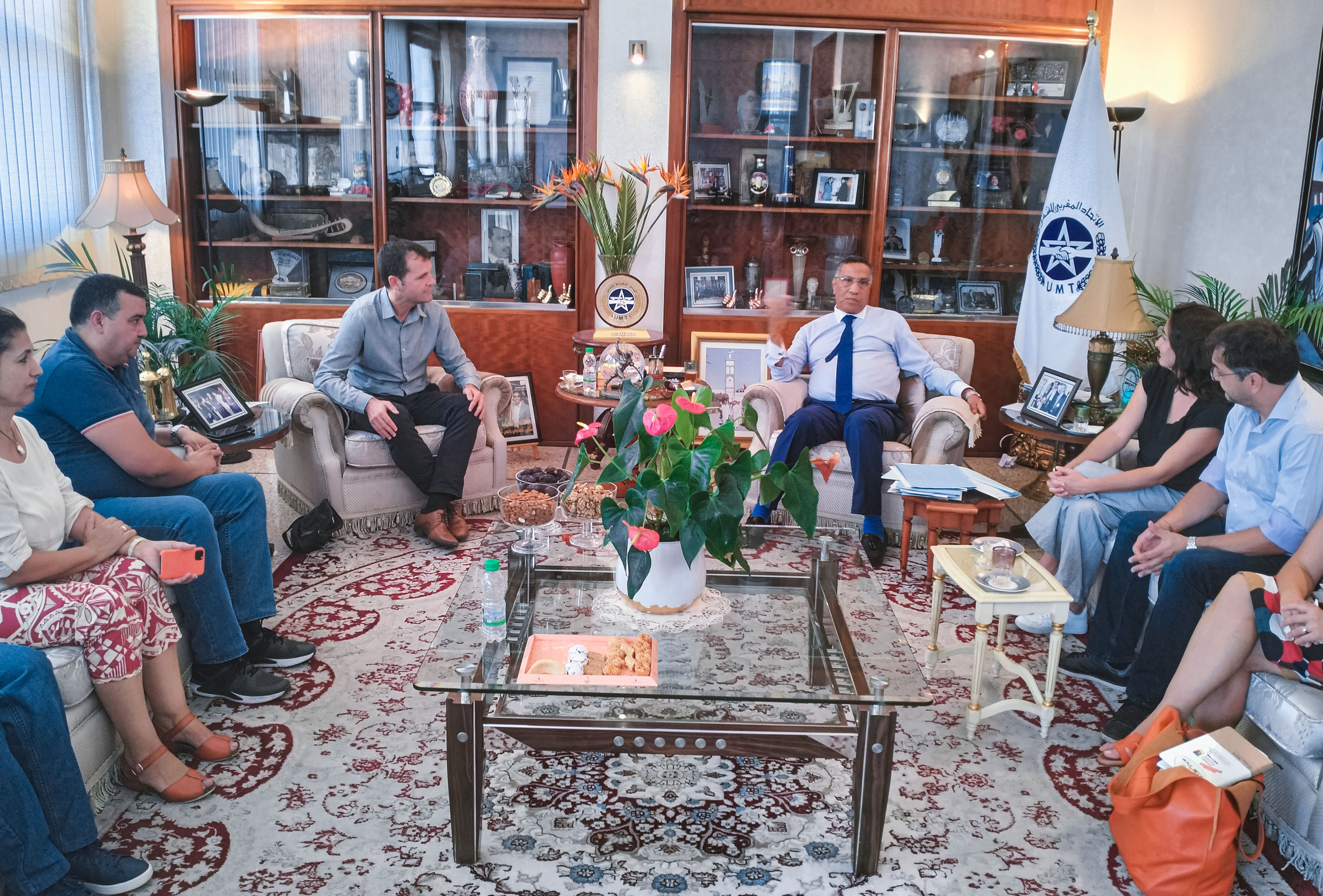 استقبل الأخ الميلودي المخارق، الأمين العام للاتحاد المغربي للشغل بمعية وفد من الأمانة الوطنية، السيد بينوا تيست Benoit TESTE ، الكاتب العام للفدرالية النقابية الموحدة FSU الفرنسية مرفوقا بوفد هام عن نقابات الهيآت الدبلوماسية والتعليمية الفرنسية بالمغرب، وذلك يوم السبت 8 أكتوبر 2022، بالمقر المركزي للاتحاد المغربي للشغل، بالدار البيضاء.