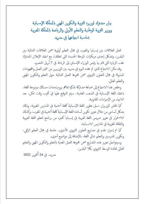 أجرى وزير التربية الوطنية والتعليم الأولي والرياضة، شكيب بنموسى، بمدريد، مباحثات مع وزيرة التربية والتكوين المهني الإسبانية، بيلار أليغريا، تمحورت حول سبل تعزيز التعاون في المجال التربوي. وشكل هذا اللقاء، الذي حضره كاتب الدولة الإسباني في التعليم، خوسي مانويل بار، وسفيرة المغرب بمدريد، السيدة كريمة بنيعيش، ومسؤولون بالوزارتين، مناسبة لتسليط الضوء على العمل والمجهودات المبذولة في مجال التعاون التربوي ضمن مجموعة العمل الثنائية حول التعليم والتكوين المهني والتعليم العالي. وجاء في إعلان مشترك، صدر في ختام الاجتماع، أنه خلص إلى صياغة مشتركة لمذكرة تفاهم تروم إحداث مسالك مزدوجة اللغة، باعتماد اللغة الإسبانية في الشعب العلمية، والتي سيتم التوقيع عليها، بين الجانبين في أقرب وقت ممكن، بعد الانتهاء من الإجراءات القانونية. وناقش الوزيران، بهذه المناسبة، سبل تطوير اللغة الإسبانية كلغة أجنبية في المدارس المغربية، وذلك بشكل أساسي من خلال تعزيز تكوين أساتذة اللغة الإسبانية كلغة أجنبية في المغرب، وكذلك الاستمرار في تعزيز تدريس اللغة العربية في إسبانيا كجزء من برنامج لتعليم اللغة العربية والثقافة المغربية في المدارس الإسبانية. وأضاف المصدر ذاته أنه تم، أيضا، إحراز تقدم في مشاريع التعاون التربوي الأخرى خاصة في مجال رقمنة التعليم، وتكوين المدرسين والتعليم ثنائي اللغة، بالإضافة إلى مواضيع أخرى، مشيرا إلى أنه سيتواصل تعزيز هذه المشاريع ضمن مجموعة العمل المعنية بالتعليم والتكوين المهني والتعليم العالي لفائدة الوسط التربوي بكلا البلدين. وخلص البلاغ إلى أن العلاقات بين إسبانيا والمغرب في مجال التعليم تحظى بأولوية ضمن العلاقات الثنائية بين البلدين، وتشكل إحدى مرتكزات المرحلة الجديدة التي انطلقت مع اعتماد الإعلان المشترك عقب الزيارة التي قام بها رئيس الوزراء الإسباني إلى الرباط في 7 أبريل المنصرم. وفي وقت سابق، قام بنموسى، برفقة السيد مانويل بار، بزيارة المعهد الإسباني لتقنيات التعليم وتدريب المعلمين، حيث قدمت له شروحات حول نظام التعليم الإسباني وخطة الرقمنة والمهارات الرقمية.