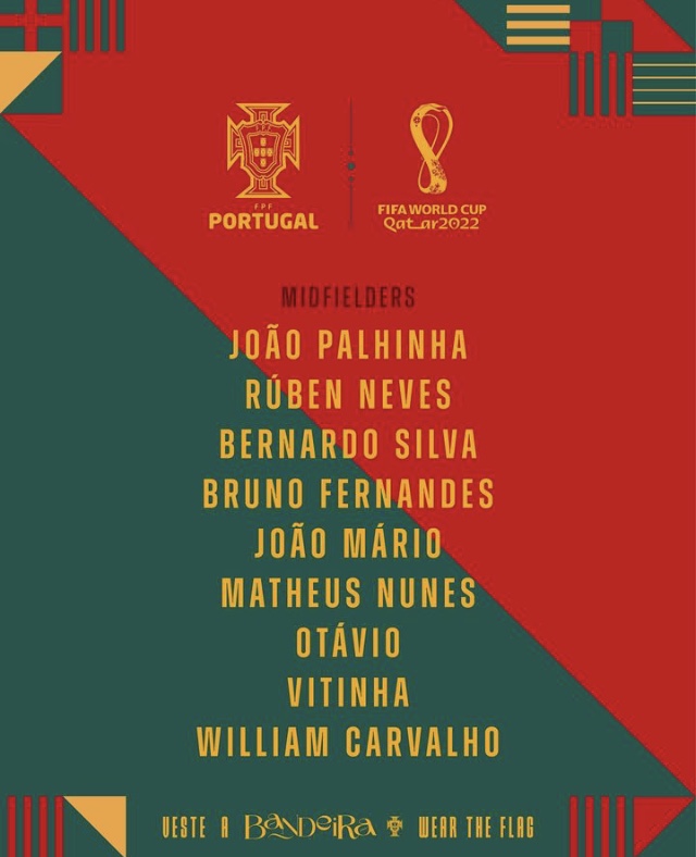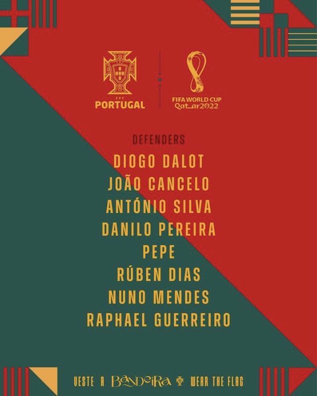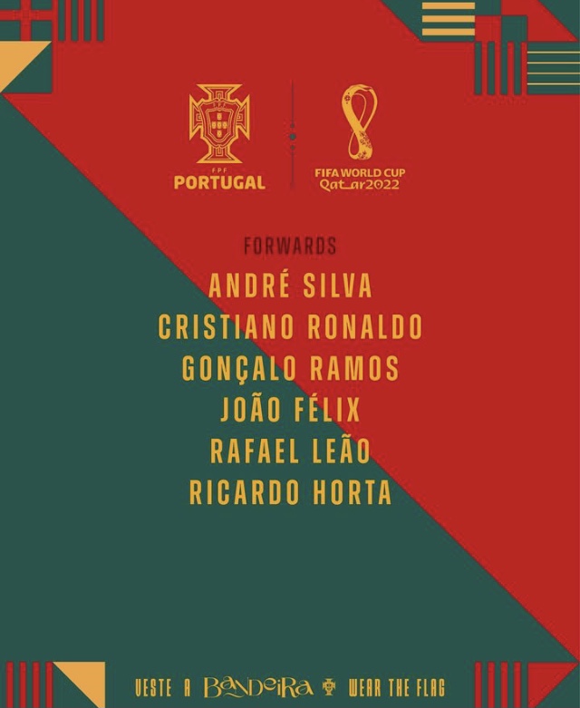 يستعد منتخب البرتغال لخوض منافسات كأس العالم 2022، المقام بقطر خلال الفترة من ٢٠ نوفمبر الجاري حتى ١٨ ديسمبر المقبل، بعدما أسفرت قرعة المونديال عن وقوعه على رأس المجموعة الثامنة بجانب أوروجواي، كوريا الجنوبية، غانا،و أعلن اليوم فرناندو سانتوس المدير الفني لمنتخب البرتغال عن قائمة منتخب بلاده،حيث تتكون من : حراسة المرمى: ديوجو كوستا - روي باتريسيو - جوزيه سا. خط الدفاع: ديوجو دالوت - جواو كانسيلو - دانيلو بيريرا - بيبي - روبن دياز - تياجو دجالو - نونو مينديز - رافاييل جيريرو. خط الوسط: روبن نيفيز - جواو بالينيا - وليام كارفاليو - ريناتو سانسيز - ماتيوس نونيز - برونو فرنانديز - فيتينيا - أوتافيو - جواو ماريو. خط الهجوم: برناردو سيلفا - رافايل لياو - جواو فيلكس - ريكاردو هورتا - أندريه سيلفا - كريستيانو رونالدو.