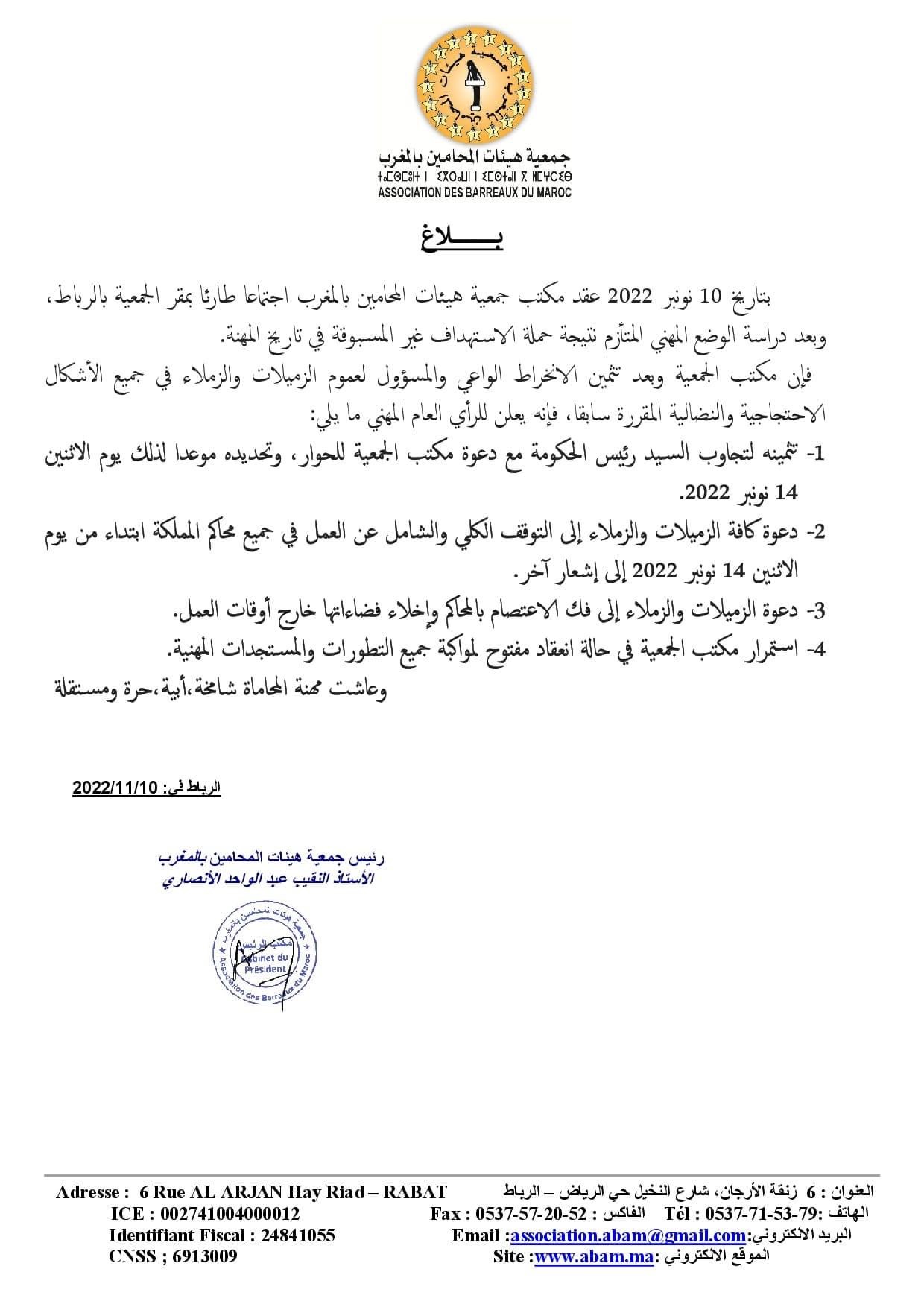 بلاغ جمعية هيئات المحامين بالمغرب يومه الخميس 10 نونبر 2022