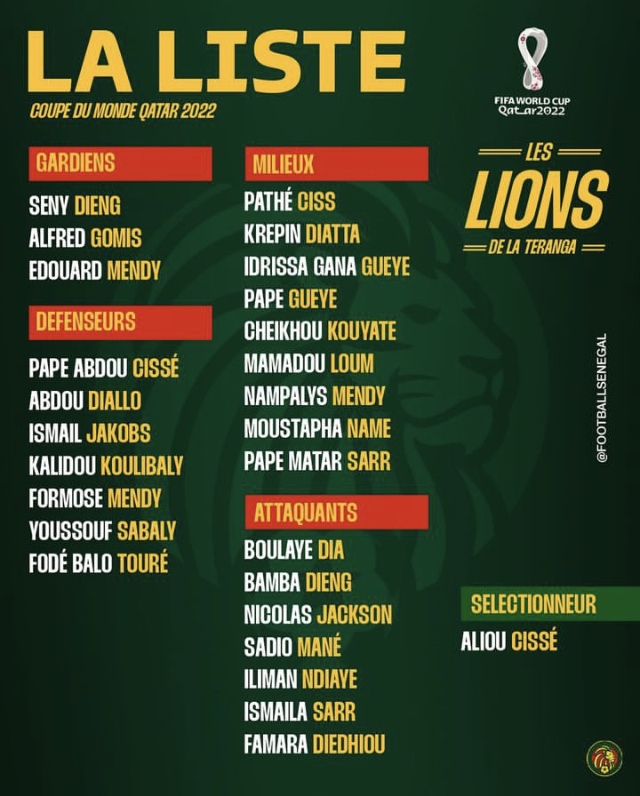 أعلن السنغالي، أليو سيسيه، المدير الفني لمنتخب السنغال، قائمة تضم 26 لاعبًا استعدادا لخوض غمار منافسات كأس العالم قطر 2022، وجاء على رأسهم ساديو ماني نجم بايرن ميونخ الألماني. وتواجد ساديو ماني في قائمة السنغال رغم الأراء التي ترددت مؤخرا أنه سيكون خارج الحسابات في المشاركة بمونديال قطر على خلفية إصابته في مباراة بايرن ميونخ وفيردر بريمن الأخيرة في الدوري الألماني. وجاءت قائمة منتخب السنغال المستدعاة في كأس العالم قطر 2022 على النحو التالي: حراسة المرمى: إدوارد ميندي (تشيلسي)، ألفريد جوميس (ستاد رين)، سيني دينج (كوينز بارك رينجرز). خط الدفاع: كاليدو كوليبالي (تشيلسي)، عبدو ديالو (لايبزيج)، يوسف سابالي (ريال بيتيس)، فورميس ميندي (أماينز)، فودي بالو توريه (ميلان)، بابي سيسيه (أولمبياكوس)، إسماعيل جاكوبس (موناكو). خط الوسط: إدريسا جانا جايي (إيفرتون)، بابي مطر سار (توتنهام)، نامبليس ميندي (ليستر سيتي)، بابي جايي (مارسيليا)، كيربن دياتا (موناكو)، شيخو كوياتيه (نوتينجهام فورست)، مصطفى نامي (بافوس)، مامادو لوم نداي (ريدينج). خط الهجوم: ساديو ماني (بايرن ميونخ)، إسماعيلا سار (واتفورد)، بامبا ديانج (مارسيليا)، كيتا بالدي (سبارتك موسكو)، فامارا ديادهيو (ألانيا سبور)، إلمان ندايي (شيفيلد يونايتد)، بولاي ديا (ساليرنتينا)، نيكولاس جاكسون (فياريال). الاتحاد السنغالى، متفائل بمشاركة ساديو مانى فى كأس العالم 2022، والتى تستضيفها قطر فى الفترة من 20 نوفمبر حتى 18 ديسمبر، وذلك على الرغم من الإصابة التى تعرض لها الثلاثاء الماضي. وغادر مانى مواجهة فريقه الثلاثاء مع فيردر بريمن، متأثرا بإصابته، بعد مرور 20 دقيقة على بدايتها، ودخل بدلا منه ليروى سانى. ويخوض المنتخب السنغالى نهائيات مونديال قطر، ضمن منتخبات المجموعة الأولى، مع كل من قطر، هولندا والإكوادور.