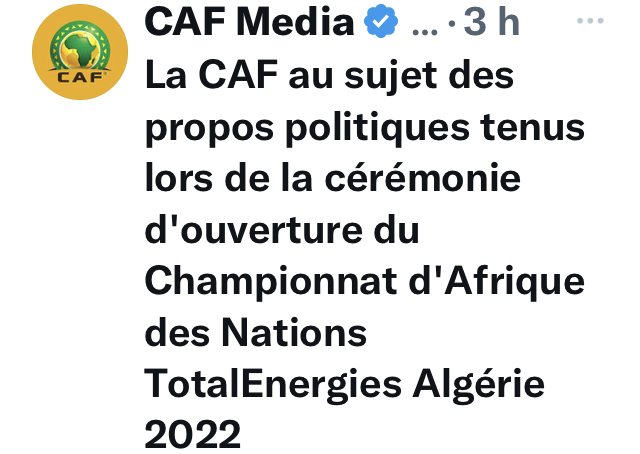 أصدر الاتحاد الأفريقي لكرة القدم الكاف برئاسة الجنوب أفريقي باتريس موتسيبي، بيانًا حول التصريحات السياسية في افتتاح أمم أفريقيا للمحليين. وقال الكاف عبر موقعه الرسمي اليوم الأحد: الاتحاد الأفريقي لكرة القدم ملزم، وفقا لأنظمته ولوائحه الأساسية ولوائح الفيفا بعدم المشاركة أو التورط في السياسة والحياد في المسائل ذات الطابع السياسي. وتابع: تم إبلاغ الاتحاد الأفريقي لكرة القدم بأنه تم الإدلاء ببعض التصريحات السياسية خلال حفل افتتاح بطولة كأس أمم أفريقيا للمحليين في الجزائر 2022 يوم الجمعة الماضي في الجزائر العاصمة. وواصل: هذه التصريحات السياسية ليست تصريحات الاتحاد الأفريقي لكرة القدم، ولا تعكس وجهات نظر أو آراء الاتحاد الأفريقي كمنظمة محايدة سياسيا. وختم: سيقوم الاتحاد الأفريقي لكرة القدم بالتحقيق والنظر في البيانات والأحداث السياسية في حفل افتتاح البطولة، وتقييم ما إذا كان هناك امتثال للوائح ولوائح الاتحاد الأفريقي لكرة القدم والفيفا. وسيقدم الاتحاد الأفريقي تحديثا في هذا الصدد في الوقت المناسب