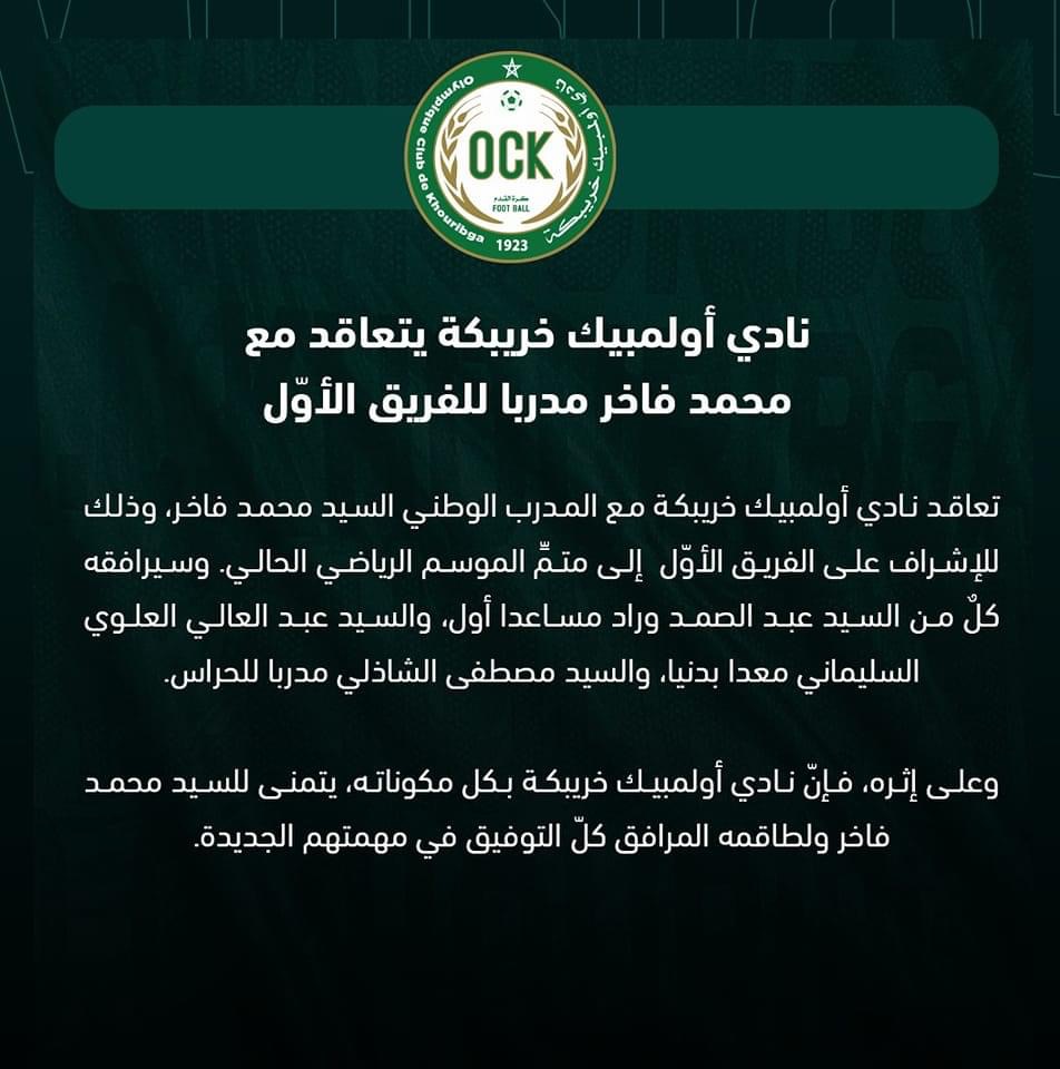 نشر نادي أولمبيك خريبكة لكرة القدم بلاغا عبر صفحته الرسمية بموقع للتواصل الاجتماعي، أشار من خلاله إلى أنه تعاقد مع المدرب الوطني محمد فاخر ،من أجل الإشراف على الفريق الأول إلى متم الموسم الرياضي الحالي. وبعدما أوضح البلاغ أن المدرب محمد فاخر سيُرافقه كل من عبد الصمد وراد، مساعدا أول، وعبد العالي العلوي السليماني، معدا بدنيا، ومصطفى الشاذلي، مدربا للحرّاس، تمنى نادي أولمبيك خريبكة بكل مكوناته لفاخر وطاقمه المرافق كل التوفيق في مهامهم الجديدة. وكان المكتب المديري لنادي أولمبيك خريبكة لكرة القدم أكد، نهاية الشهر الماضي، أنه فوجئ بغياب المدرب البرتغالي ريكاردو فورموزينهو وطاقمه التدريبي البرتغالي، المكون من دانيال ديكاسترو وميكيل ميرا، عن موعد الحصتين التدريبيتين المقررتين بداية هذا الأسبوع. وأضاف المكتب المديري حينها، في بلاغ له، أن المدرب البرتغالي وأفراد الطاقم التدريبي اتخذوا قرارا أحاديا يقضي بفسخ العقود من طرف واحد دون وجود أسباب موجبة للفسخ، وهي خطوة مفاجئة تأتي في وقت بدأ الفريق يخطو بثبات نحو تحقيق نتائج إيجابية
