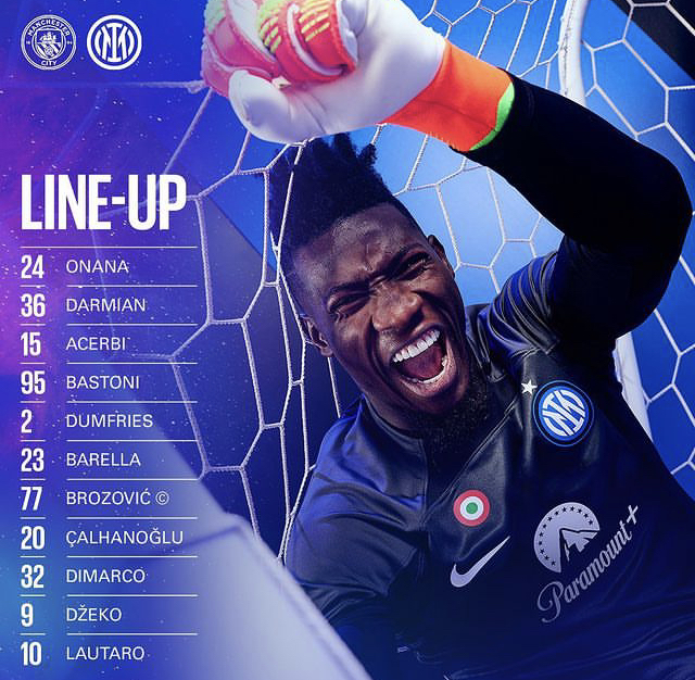 أعلن المدير الفني لنادي مانشستر سيتي الانجليزي بيب غوارديولا ، عن التشكيلة الأساسية التي ستخوض مواجهة انتر ميلان الإيطالي ، مساء يوم السبت على اتاتورك الاولمبي، لحساب منافسات الدور النهائي لبطولة دوري ابطال اوروبا ،وهي كالآتي : * حراسة المرمى: إيدرسون * خط الدفاع: أكانجي دياز ووكر * خط الوسط: جريليش رودري جون ستونز برناردو سيلفا * خط الهجوم: جوندوجان هالاند دي بروين، فيما حسم إنتر ميلان تأهله لهذا الدور، بعدما حقق فوزاً مثيراً على غريمه التقليدي فريق ميلا، بثلاثية نظيفة بمجموع المباراتين. حراسة المرمى: أندري أونانا. الدفاع: ماتيو دارميان، فرانشيسكو أتشيربي، أليساندرو باستوني. الوسط: دينزيل دومفريس، نيكولو باريلا، هاكان تشالهانوجلو، مارسيلو بروزوفيتش، فيديريكو ديماركو. * الهجوم: إدين دجيكو، لاوتارو مارتينيز