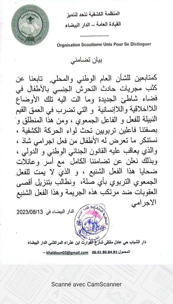 بيان تضامني : كمتابعين للشأن العام الوطني والمحلي, تابعنا عن كتب مجريات حادث التحرش الجنسي بالأطفال في فضاء شاطئ الجديدة وما الت اليه تلك الأوضاع الا اخلاقية والا إنسانية و التي تضرب في العمق القيم النبيلة للفعل و الفاعل الجمعوي، ومن هذا المنطلق و بصفتنا فاعلين تربويين تحت لواء الحركة الكشفية، نستنكر ما تعرض له الأطفال من فعل اجرامي شاذ، والذي يعاقب عليه القانون الجنائي الوطني و الدولي وبذلك نعلن عن تضامننا الكامل أسر وعائلات ضحايا هذا الفعل الشنيع، و الذي لا يمت للفعل الجمعوي التربوي بأي صلة، ونطالب بتنزيل أقصى العقوبات ضد مرتكب هذه الجريمة وهذا الفعل الشنيع الاجرامي