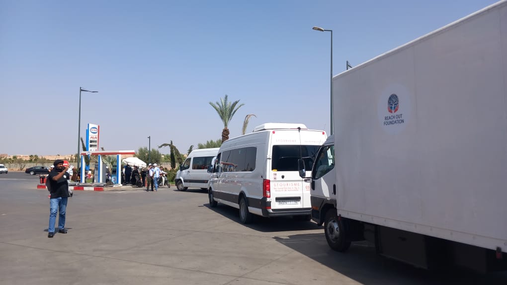 انطلاق القافلة وعلى راسها حافلة تقل صحفيين مهنيين ينضوون لجمعية مستقبلنا ومتطوعون تليها قافلة منظمة Reach Out الى دواوير اقليم امزميز من بينها دوار حاموش جماعة دار الجامع ودوار أݣنزا جماعة دار الجامع قيادة كيدميوة التي مازالت تعيش على وقع هزات ارتدادية ترعب الساكنة تحت خيامهم