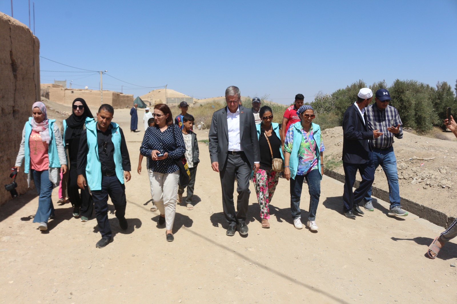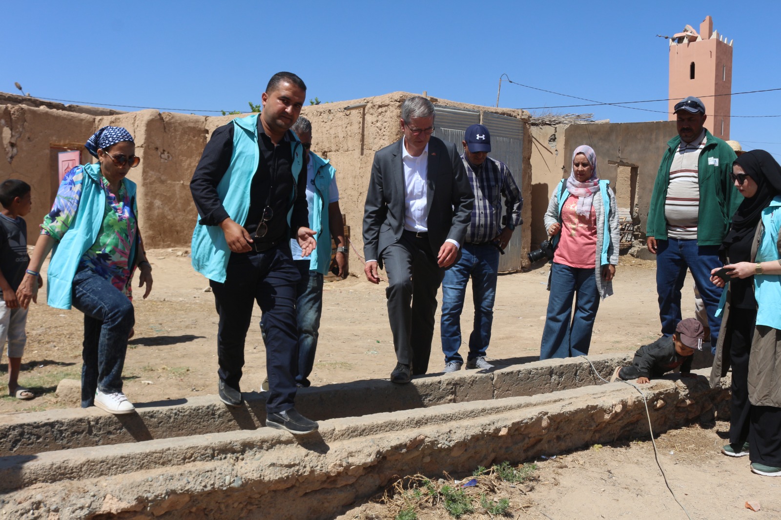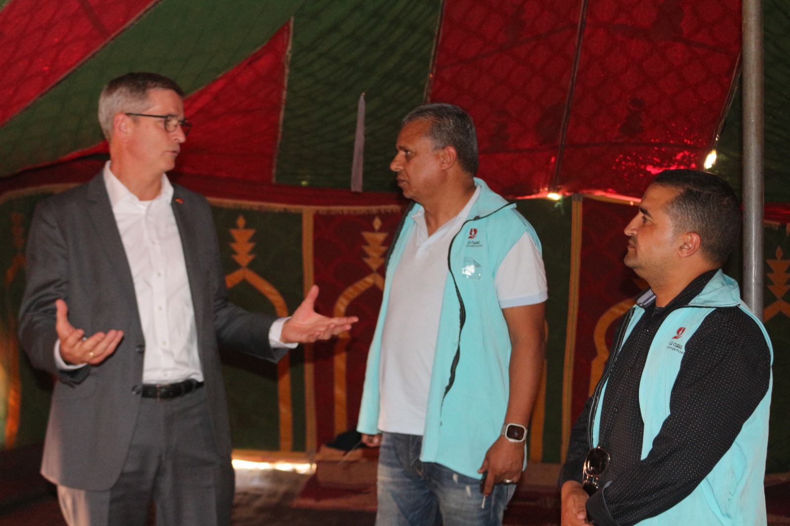 بتنسيق مع جمعية تلدات بشيشاوة و مؤسسة هانس زايدل الألمانية قام سفير جمهورية ألمانيا الإتحادية بالمغرب، السيد روبرت دولغر بزيارة ميدانية يوم الأربعاء 20.09.2023 ، لفائدة ضحايا زلزال الحوز بحيث استهدفت هذه الزيارة ساكنة دوار تالمست التابع للجماعة الترابية مجاط بإقليم شيشاوة. وجاءت هذه الزيارة تزامنا مع تنظيم جمعية تلدات لحملة تضامنية لفائدة ضحايا الكارثة الطبيعية التي تسببت في اضرار جسيمة بالدوار المذكور أعلاه مما دفع بالساكنة لاتخاذ الخيام مسكنا لهم في ظل التصدعات والانهيارات التي طالت جزءا هاما من الدوار . وفي كلمة القاها السيد السفير خلال زيارته الميدانية عبر عن مدى حزنه الكبير عندما شاهد بعينه عدد البيوت المنهارة و مدى الضرر الذي لحق بساكنة المنطقة، كما توجه بخالص العزاء إلى الشعب المغربي و أسر الضحايا إثر هذا المصاب الجليل. كما عبر عن تأثره بمظاهر التآزر التي اتسم بها المغاربة في أعقاب زلزال هذه الكارثة الطبيعية مؤكدا تضامن جمهورية ألمانيا الإتحادية مع المملكة المغربية وأن سفارة ألمانيا بالمغرب والشعب الألماني والجالية المغربية المقيمة بألمانيا تحركوا لتقديم المساعدات والدعم الكامل والاستعجالي لضحايا هذه الفاجعة ، كما اشار السيد السفير في سياق كلمته إلى أن هذه الزيارة تأتي تعبيرا عن تقاسم الحزن وتشارك تدبير الظرفية الراهنة ، متابعا حديثه أن الحكومة الألمانية على الإستعداد التام لتقديم المساعدات و دعم للأسر المتضررة بتنسيق مع جمعية تلدات و بالموازاة مع التواصل القائم بين الحكومة المغربية والسفارة بالرباط لتحديد سبل المساعدات التي تستطيع السفارة توفيرها وإعادة الإعمار للرجوع سريعا للحياة العادية. ويذكر أن جمعية تلدات قامت خلال هذه الحملة التضامنية بتوزيع مواد غذائية و أغطية ومواد للتنظيف والنظافة الشخصية وكذا مستلزمات الاطفال والنساء الى جانب تقديم الاطر الطبية الحاضرة استشارات طبية مع توزيع العديد من الأدوية على الساكنة المتضررة التي عبرت على إمتنانها لهذه الالتفاتة من طرف جمعية تلدات ،والدعم النفسي والمعنوي الذي خلفته زيارة السيد السفير .