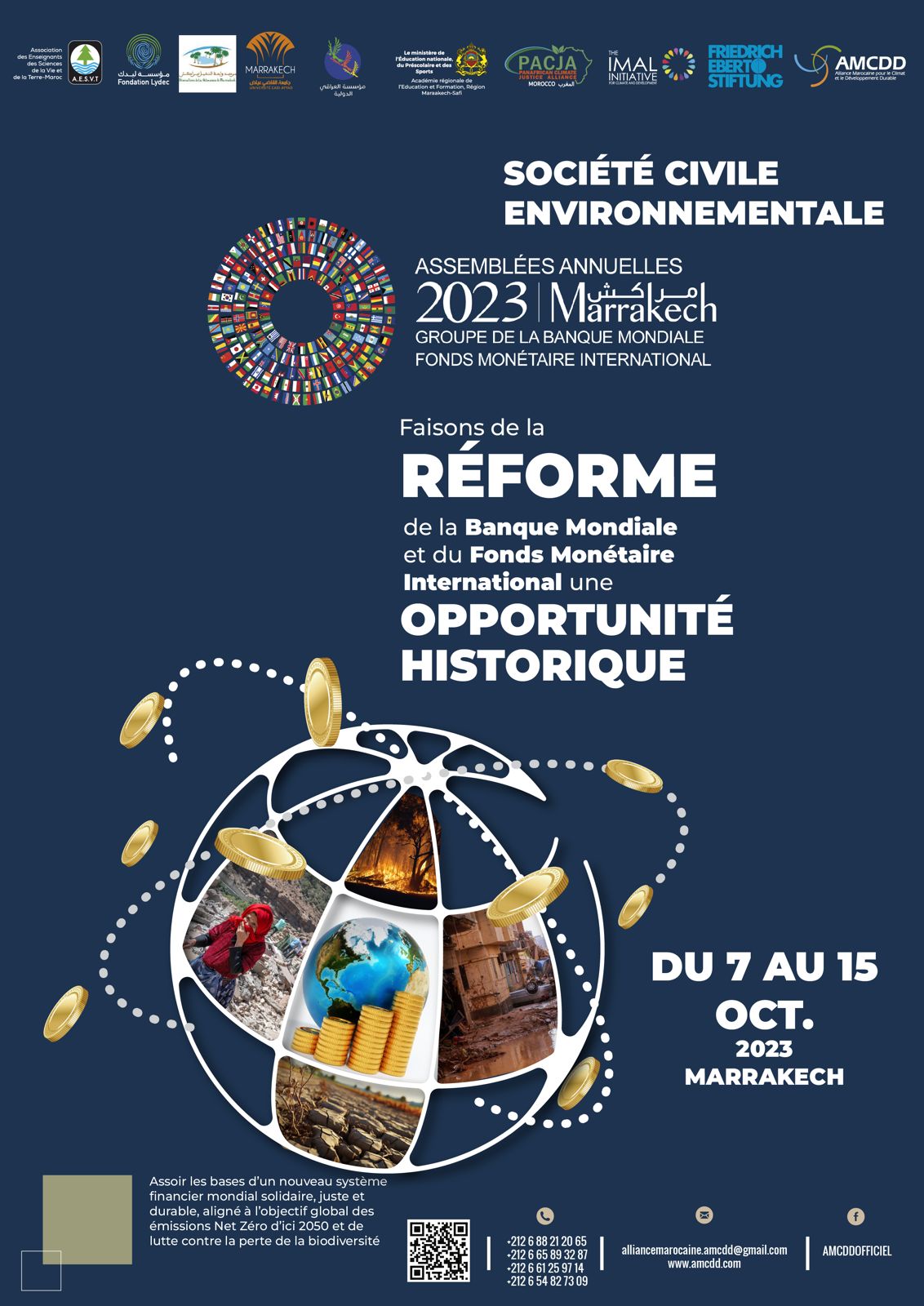 بمناسبة انعقاد الاجتماعات السنوية لصندوق النقد الدولي والبنك الدولي بالمملكة، المقررة في الفترة من 9 إلى 15 أكتوبر 2023 بمراكش، أعد المجتمع المدني البيئي المغربي والإفريقي والعالمي، بتنسيق الائتلاف المغربي من أجل المناخ والتنمية المستدامة (AMCDD)، بيان مراكش للمجتمع المدني المغربي البيئي، وسينظم يوميا في الفترة من 7 إلى 15 أكتوبر 2023، سلسلة من اللقاءات الإفريقية والدولية ومنتدى ورش الشباب ومسيرة يوم 12 أكتوبر 2023، تحت شعار: لنجعل من إصلاح البنك الدولي وصندوق النقد الدولي فرصة تاريخية "لوضع أسس نظام مالي عالمي جديد عادل ومستدام، ويتماشى مع الهدف العالمي المتمثل في تحقيق انبعاثات صفرية لغازات الدفيئة (حياد كربوني)، بحلول عام 2050 ومكافحة فقدان التنوع البيولوجي''.
