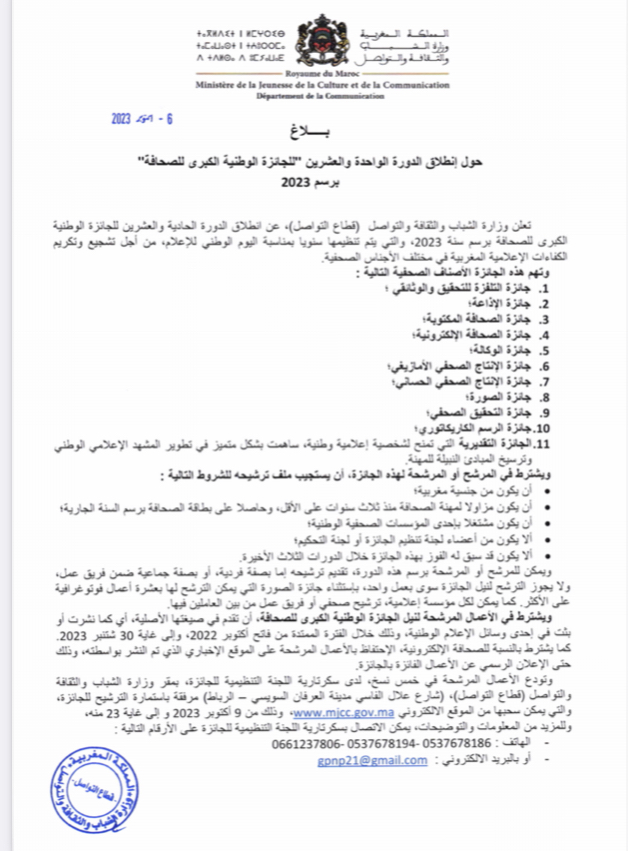 إنطلاق الدورة الحادية والعشرين للجائزة الوطنية الكبرى للصحافة برسم سنة 2023