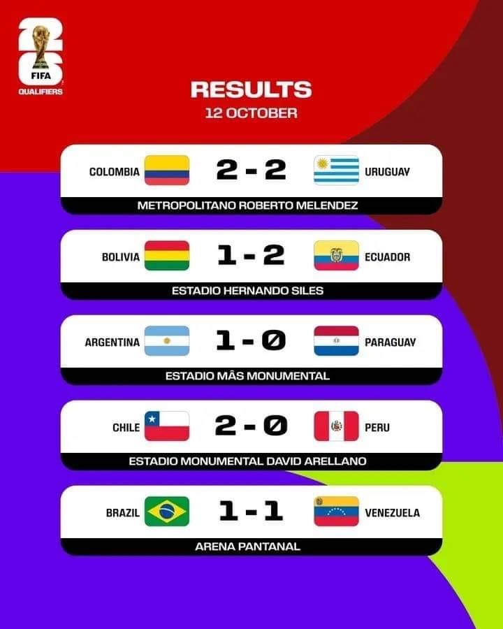 وتعادلت كولومبيا مع أوروغواي 2-2، سجل للأول خاميس رودريجيز (د 35) وماتيوس أوريبي (د 52) وللثاني ماتياس اوليفيرا (د 47) وداروين نونيز من ضربة جزاء (د90).